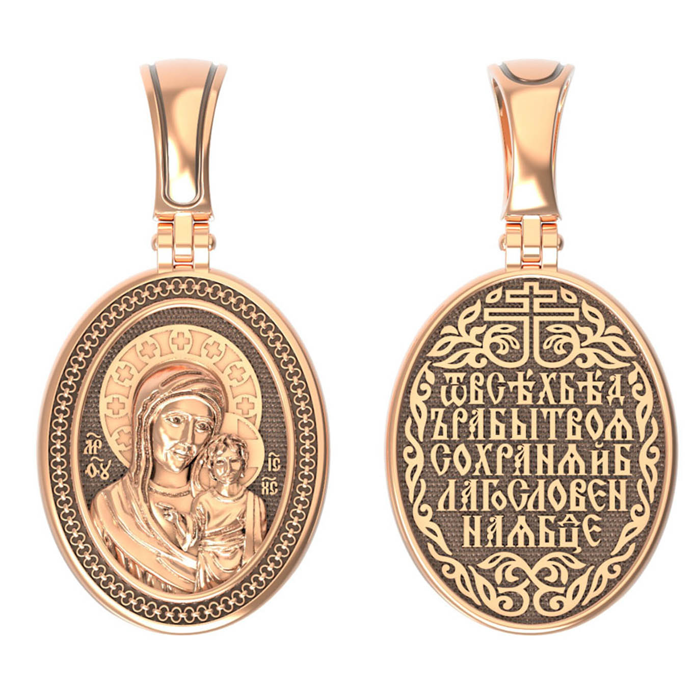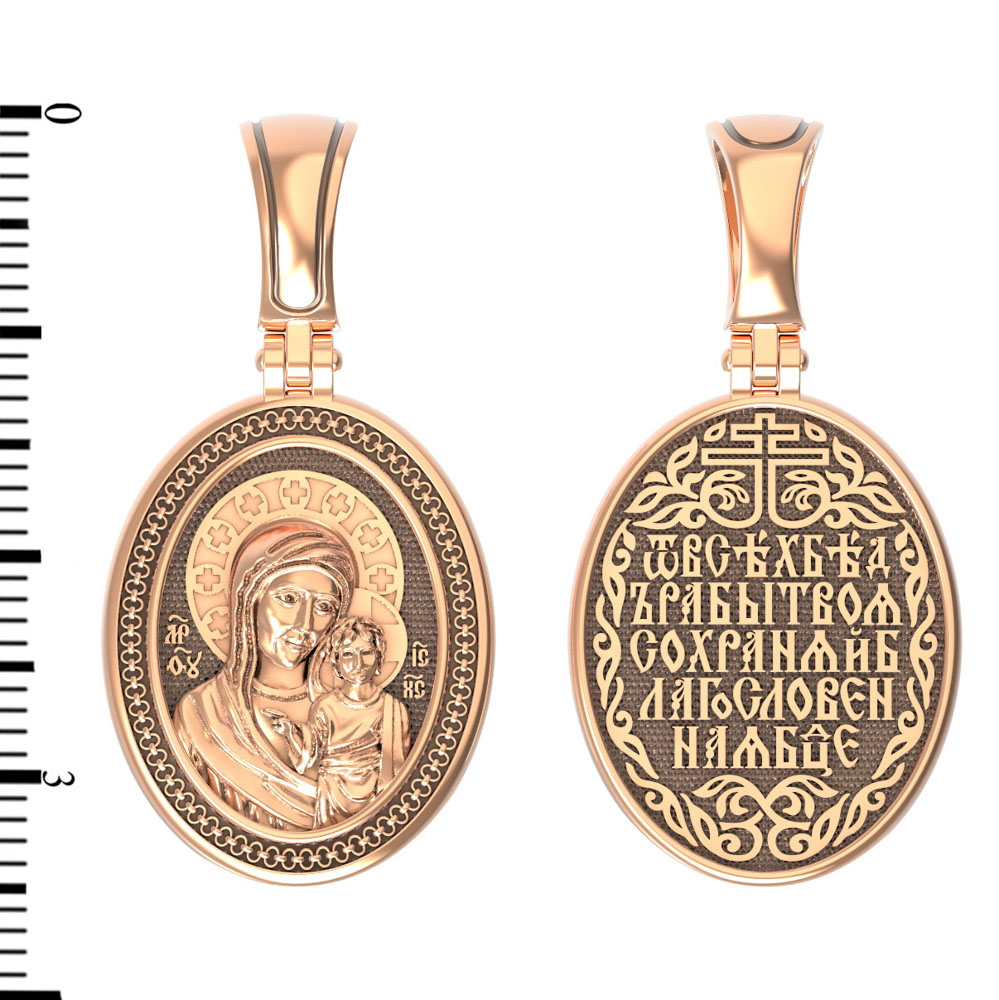 На лицевой части образка изображена Казанская икона Божией Матери — одна из самых почитаемых в России чудотворных икон Богородицы. Богословское значение Казанской иконы — указать верующим истинный Путь к спасению, который лежит через Христа. Только Божия Матерь имеет настолько сильное дерзновение к Спасителю, что может ходатайствовать перед Ним за всех верных. Именно этот образ дарится новой повенчанной паре, как хранитель очага и семейная реликвия. Молитва перед Казанской иконой Божьей Матери помогает во всех сложных случаях жизни, в болезнях, во всех печалях, невзгодах, скорбях. Уникальная история появления, чудеса, случившиеся по молитвам православных людей возле образа — все это делает Казанскую Богородицу особенной, среди тысяч других икон.