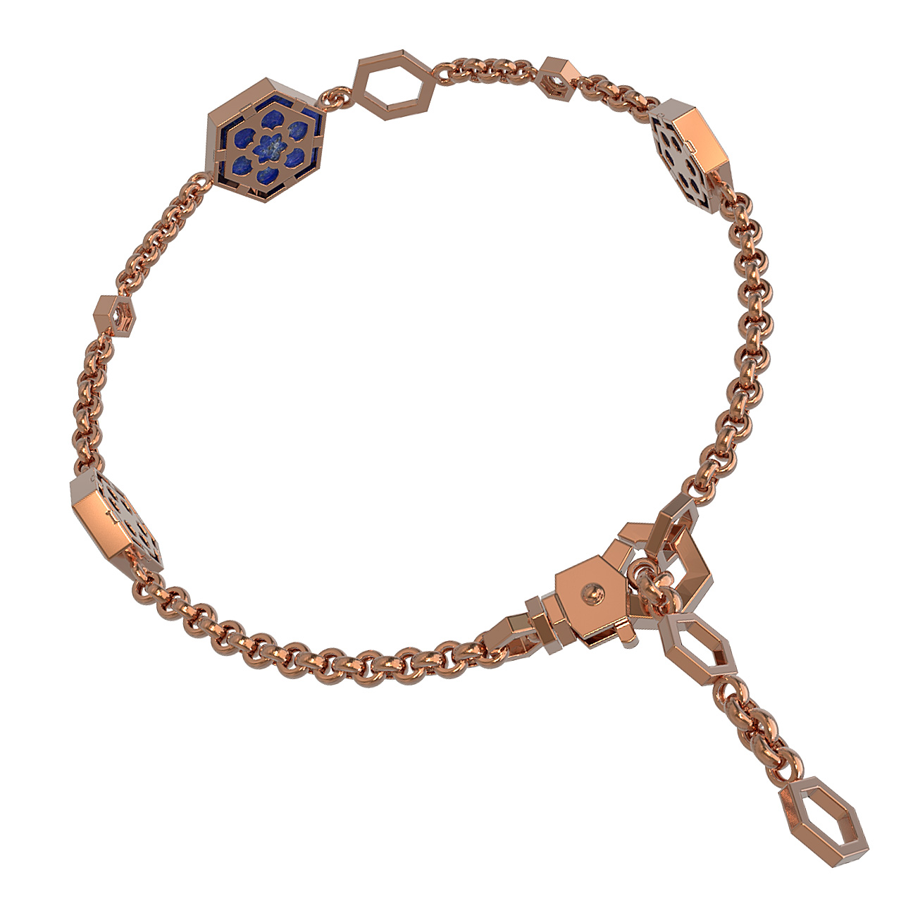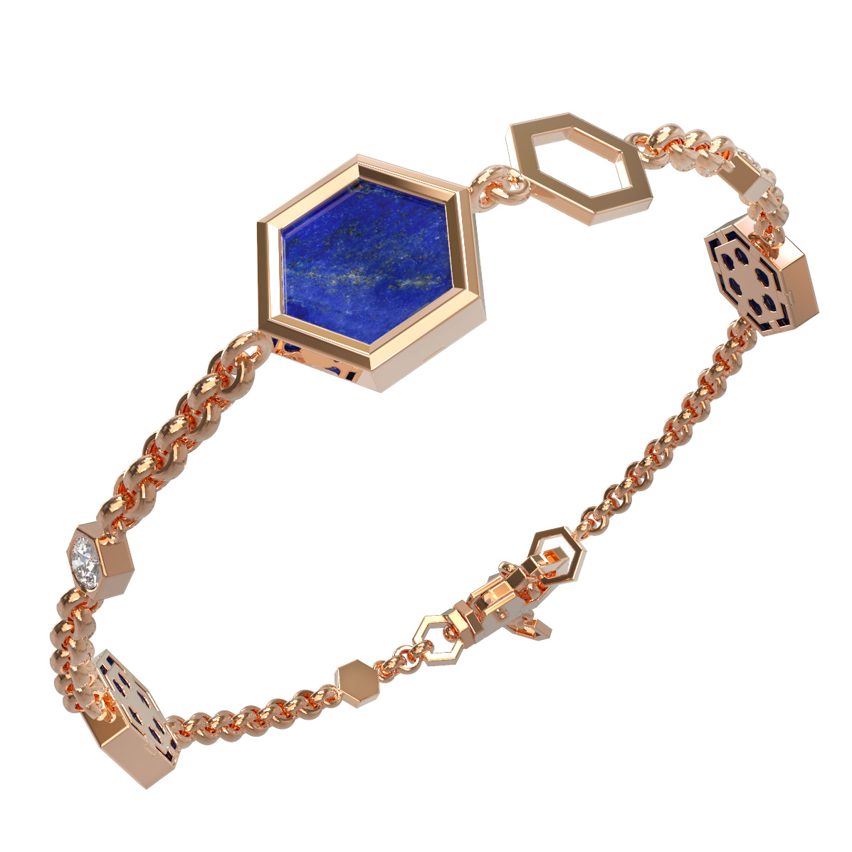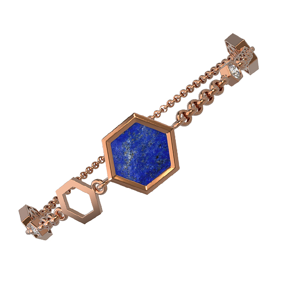 Центральным элементом композиции является выразительная вставка в форме шестигранника, выполненная из насыщенного синего лазурита. Дополняют общую картину вставки в форме круга и шестигранника из переливающегося перламутра и классического белого бриллианта. Всего в изделии использовано 3 драгоценные вставки, создающие гармоничный ансамбль. Уникальное сочетание материалов — красного золота, синего лазурита и перламутра — придает браслету статус и неповторимый шарм.