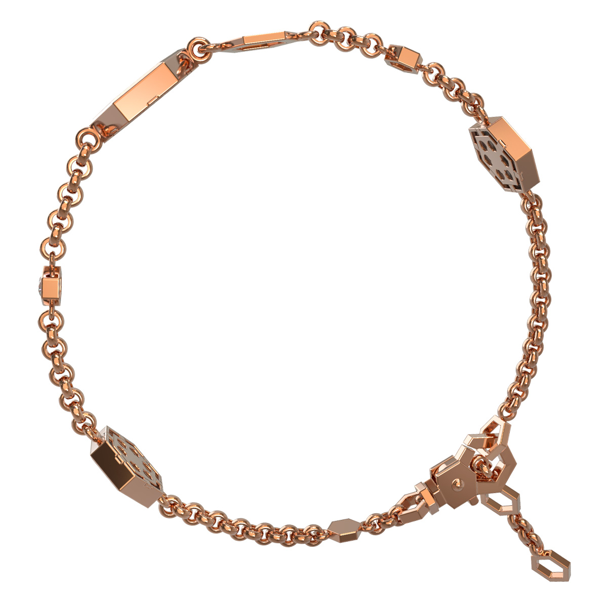 Элегантный браслет из коллекции De Luxe — Молекула воплощает в себе смелый взгляд на современное ювелирное искусство. Дизайн изделия вдохновлен структурой молекулы, что придает украшению геометрическую четкость и глубокий смысл. Это изысканное украшение выполнено из красного золота 585 пробы, чей теплый оттенок идеально подчеркивает контраст между драгоценными материалами.