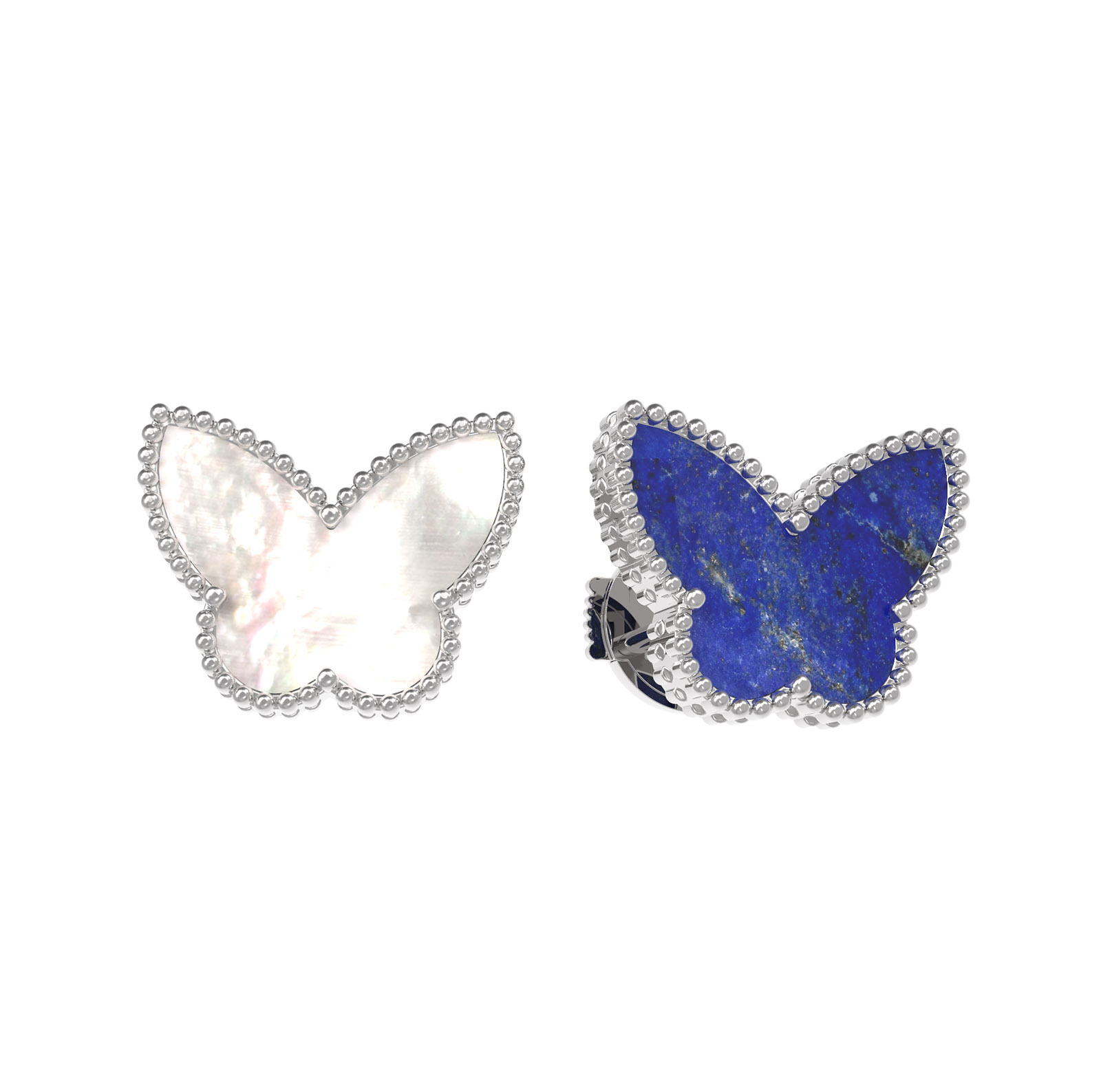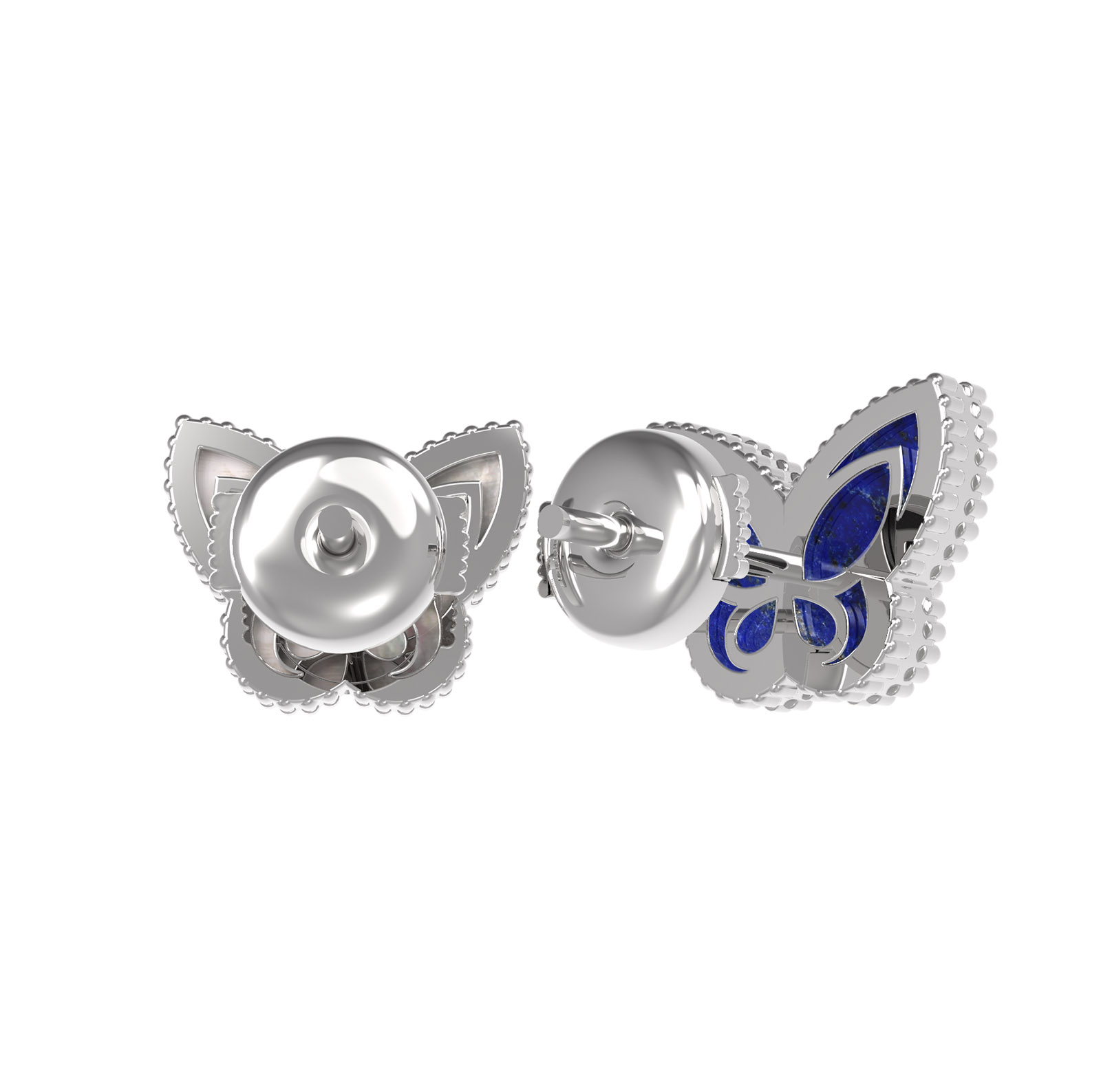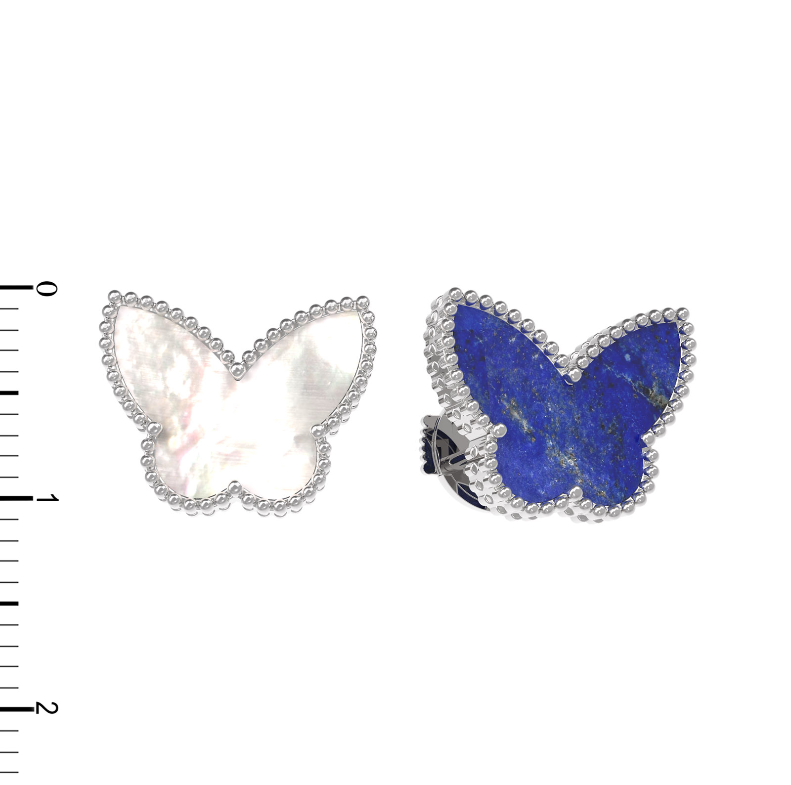Особенностью этой модели является использование контрастных материалов: одна бабочка инкрустирована синим лазуритом с его глубоким, насыщенным оттенком ночного неба, а другая выполнена из переливающегося перламутра с мягким жемчужным сиянием. Такое сочетание цветов вставок делает серьги универсальным аксессуаром, который легко дополняет как повседневные, так и вечерние образы. Каждая бабочка содержит 1 вставку, искусно ограненную для максимального раскрытия природной красоты камня.
