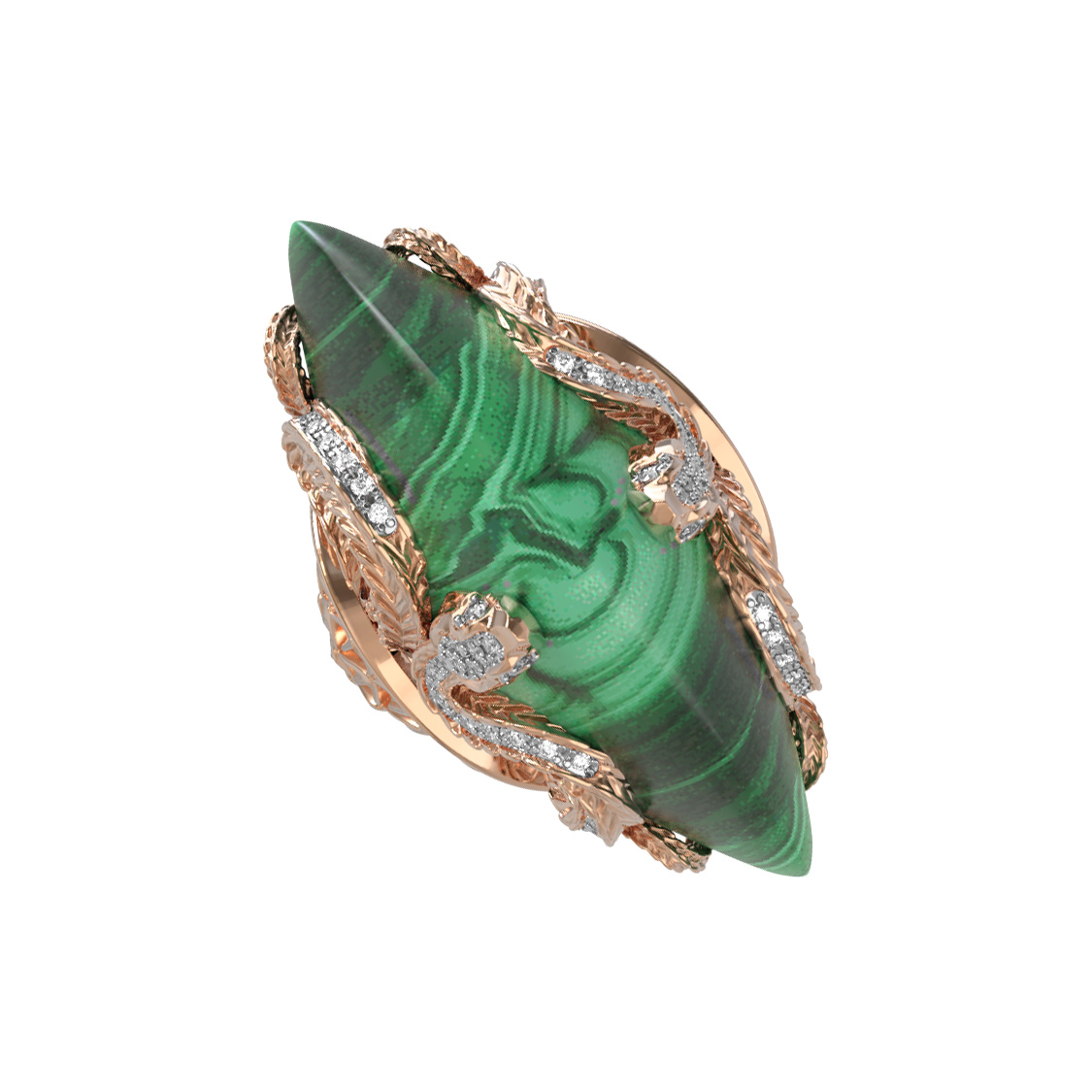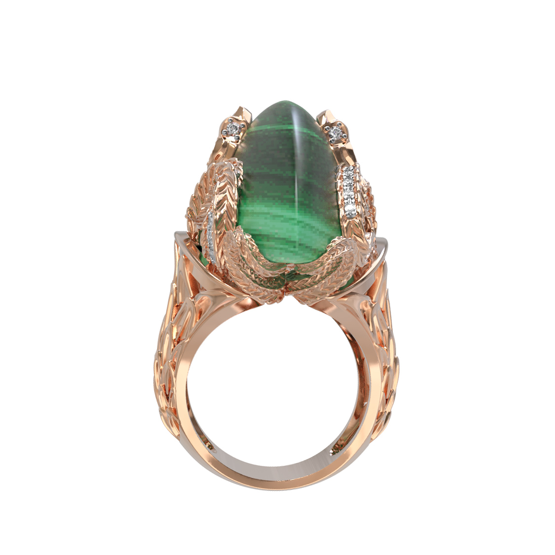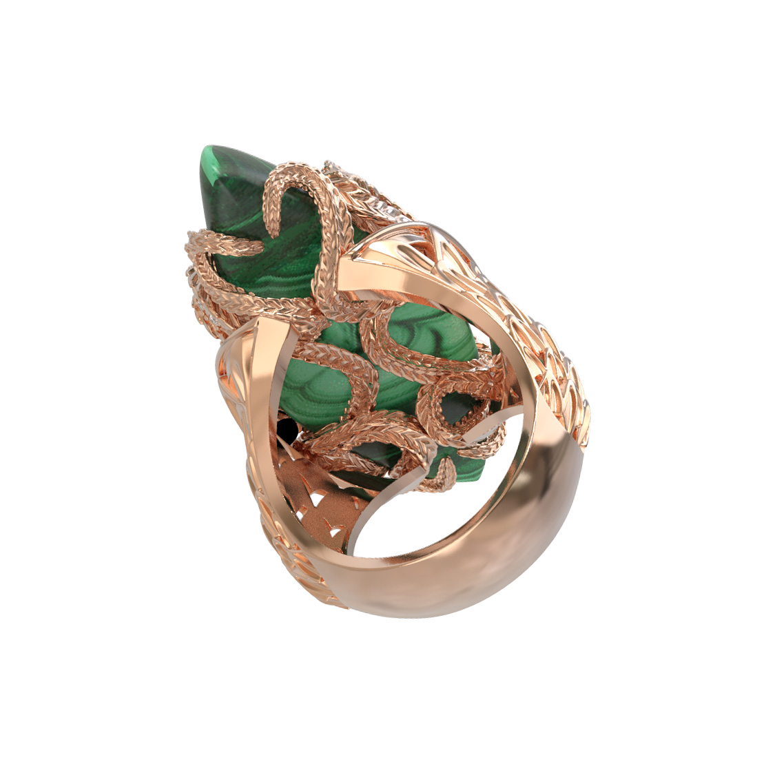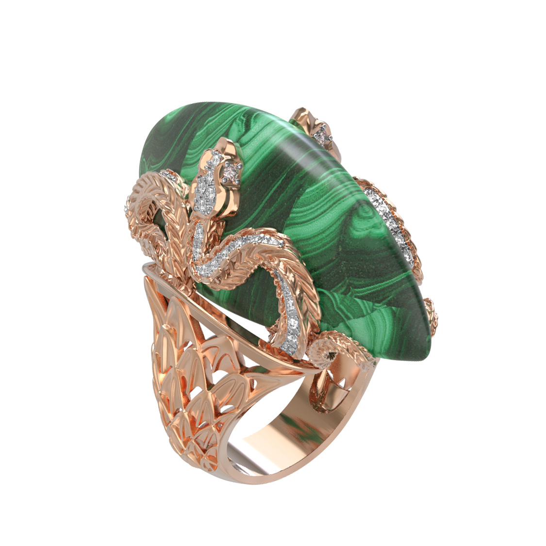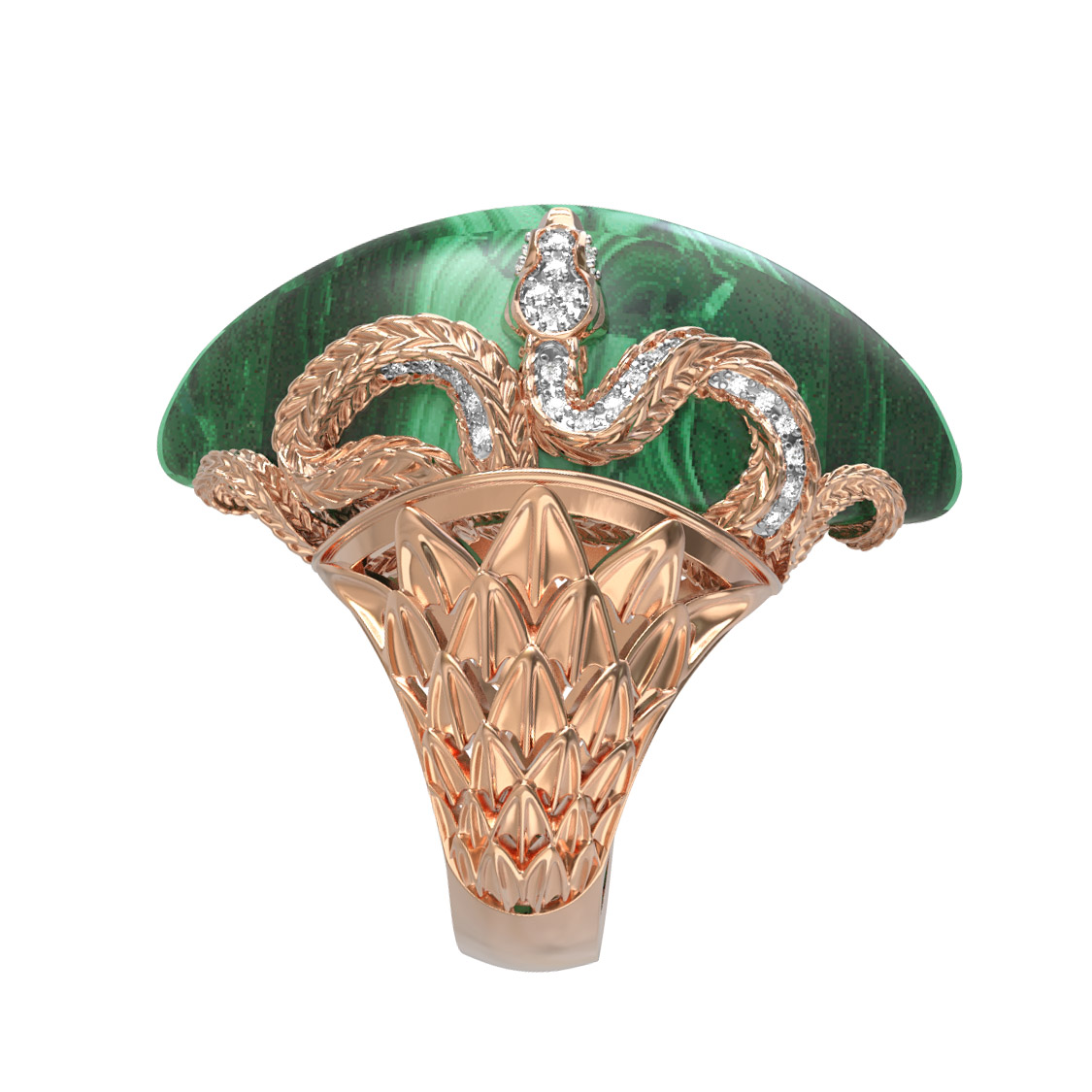Массивное украшение декорировано крупной вставкой из малахита насыщенного зеленого цвета, который идеально гармонирует с теплым оттенком красного золота. Змея, изящно обвивающая основание, инкрустирована 63 бриллиантами круглой огранки. Белые сверкающие камни создают красивый контраст с зеленым малахитом, придавая изделию глубину и премиальный блеск.