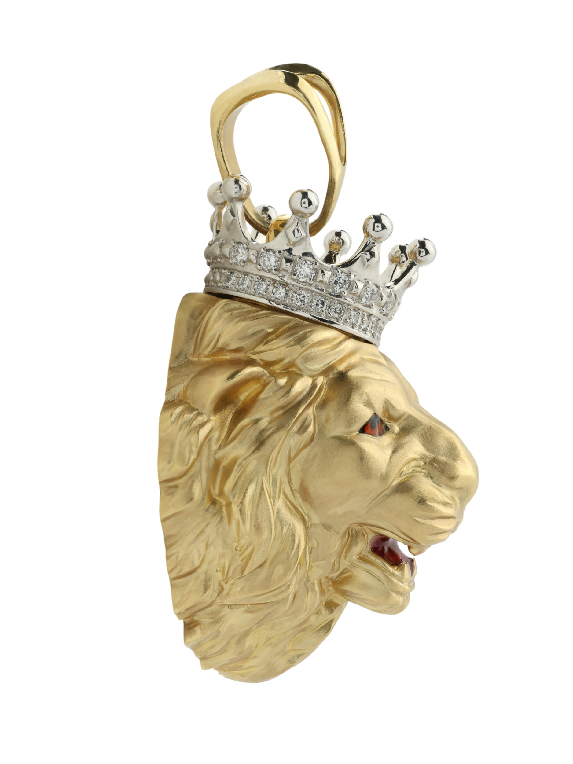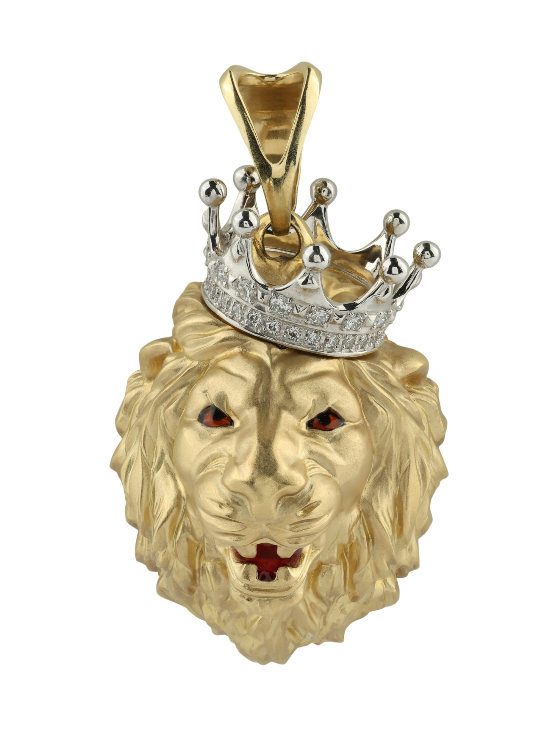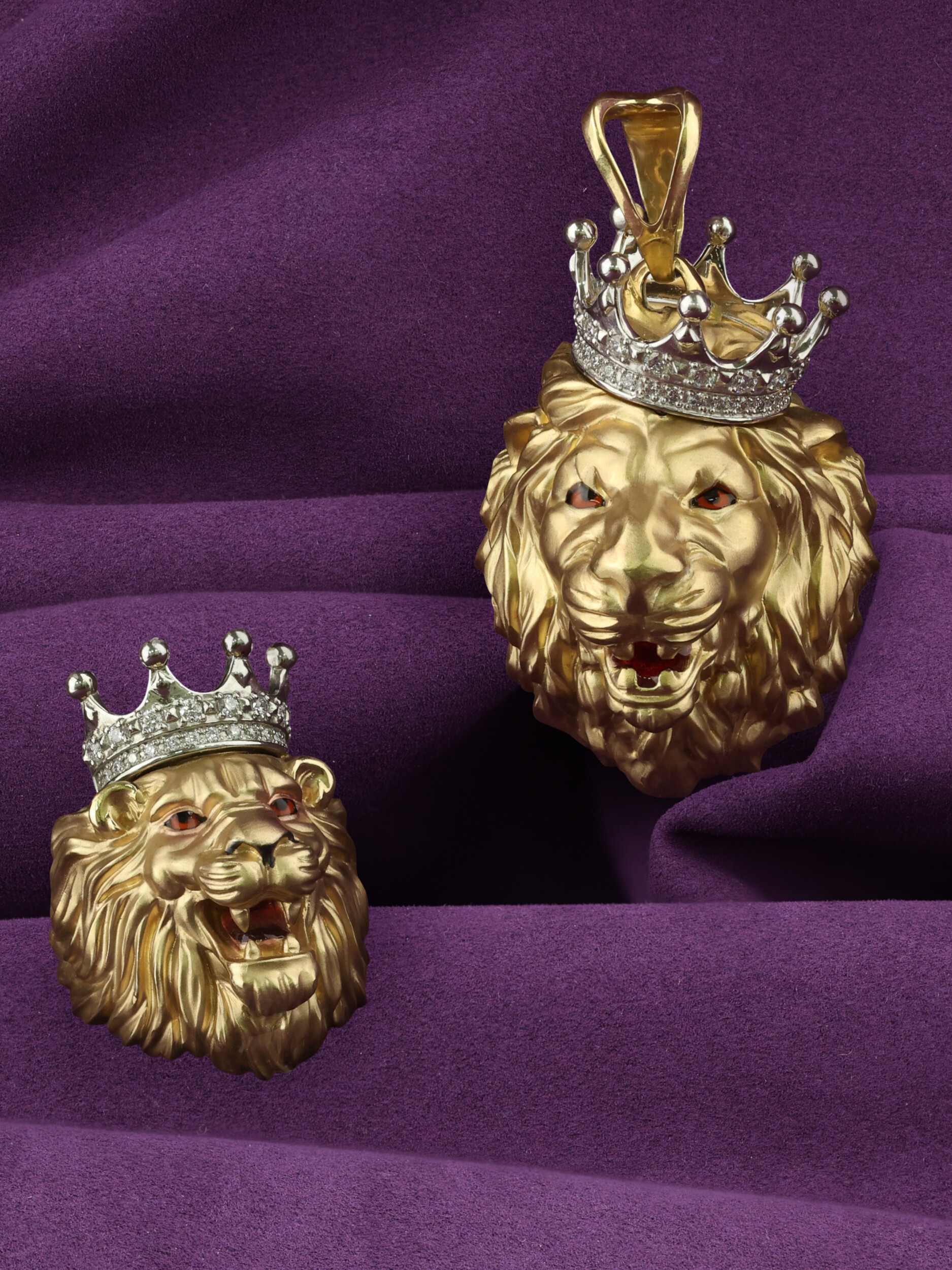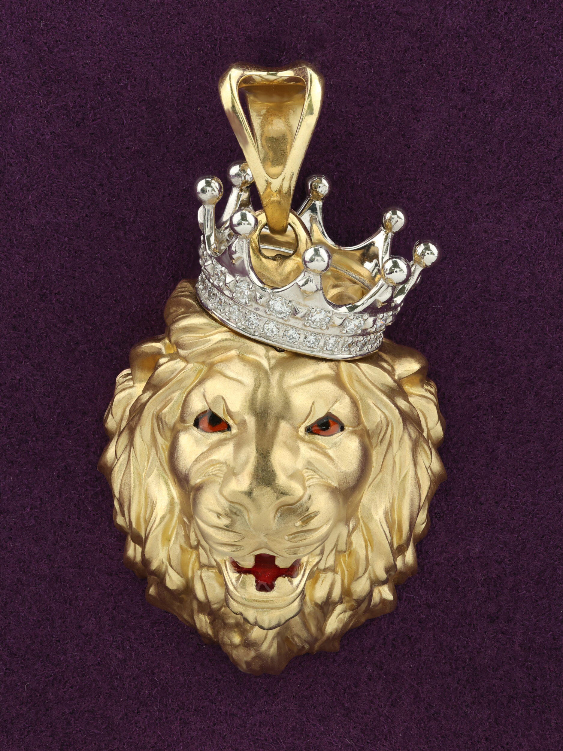 Подчеркните свою индивидуальность и статус с помощью мужской подвески из лимонного золота 585 пробы из коллекции De luxe Premium — Царь — зверей. Это украшение создано для тех, кто ценит мужественность, власть и безупречное ювелирное мастерство. Центральный элемент дизайна — величественная голова льва, выполненная с поразительной детализацией. Образ царя зверей дополнен короной, которая придает изделию по-настоящему королевский вид. Глубину и выразительность взгляду и пасти льва придает искусно нанесенная эмаль, создающая яркие акценты.