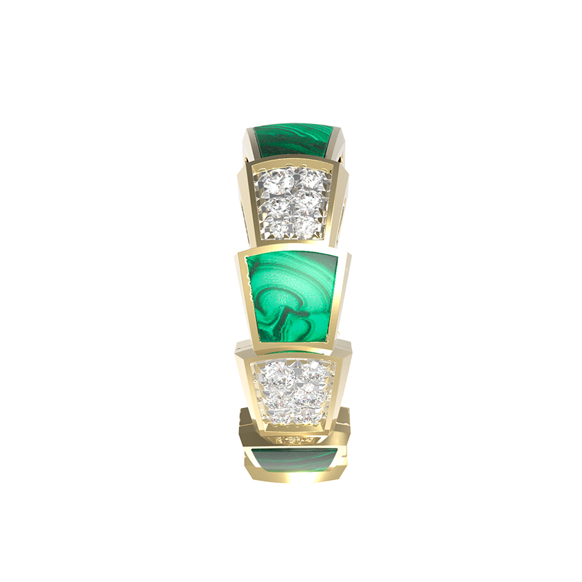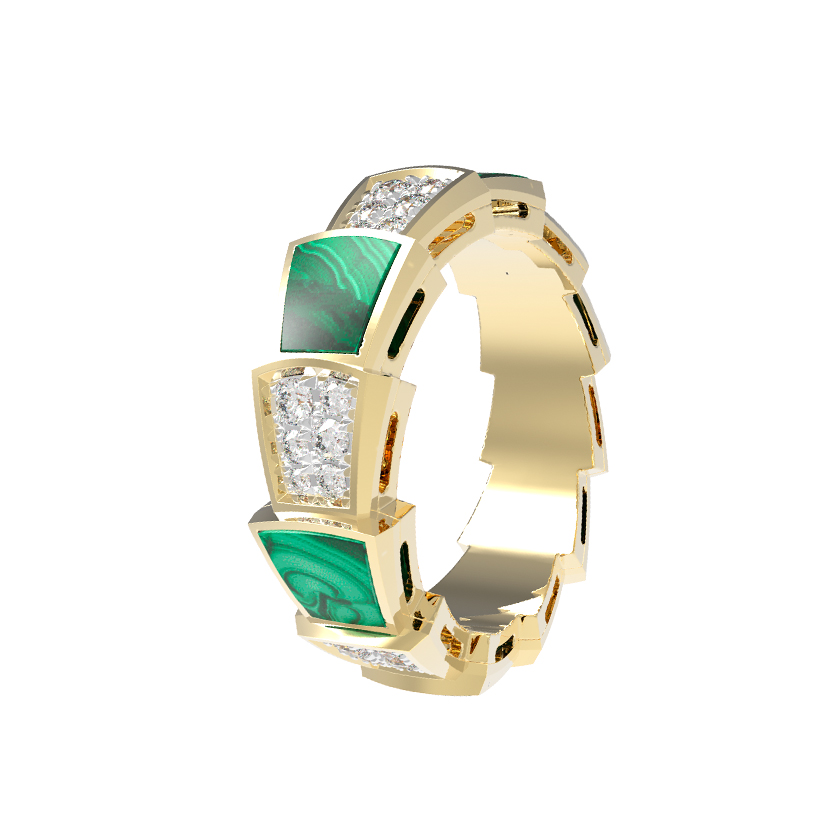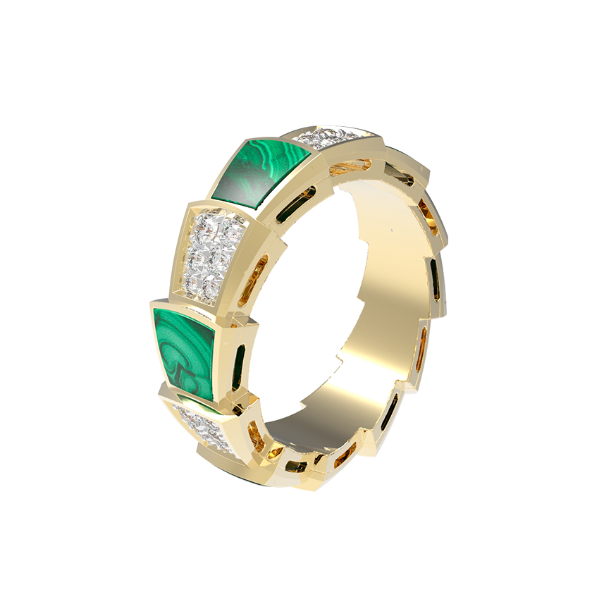 Ювелирное изделие декорировано 42 вставками круглой формы, которые гармонично распределены по всей окружности кольца. Малахитовые сегменты чередуются с паве из бриллиантов, образуя эффектный ритмичный рисунок. Это украшение универсально — оно создано как для женщин, так и для мужчин, предпочитающих статусные и выразительные аксессуары. Благодаря своей эстетике кольцо превосходно сочетается с другими украшениями, позволяя создавать полноценные комплекты.