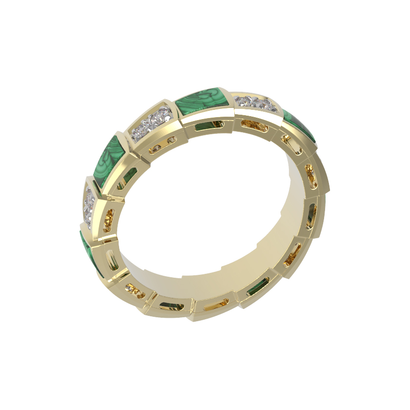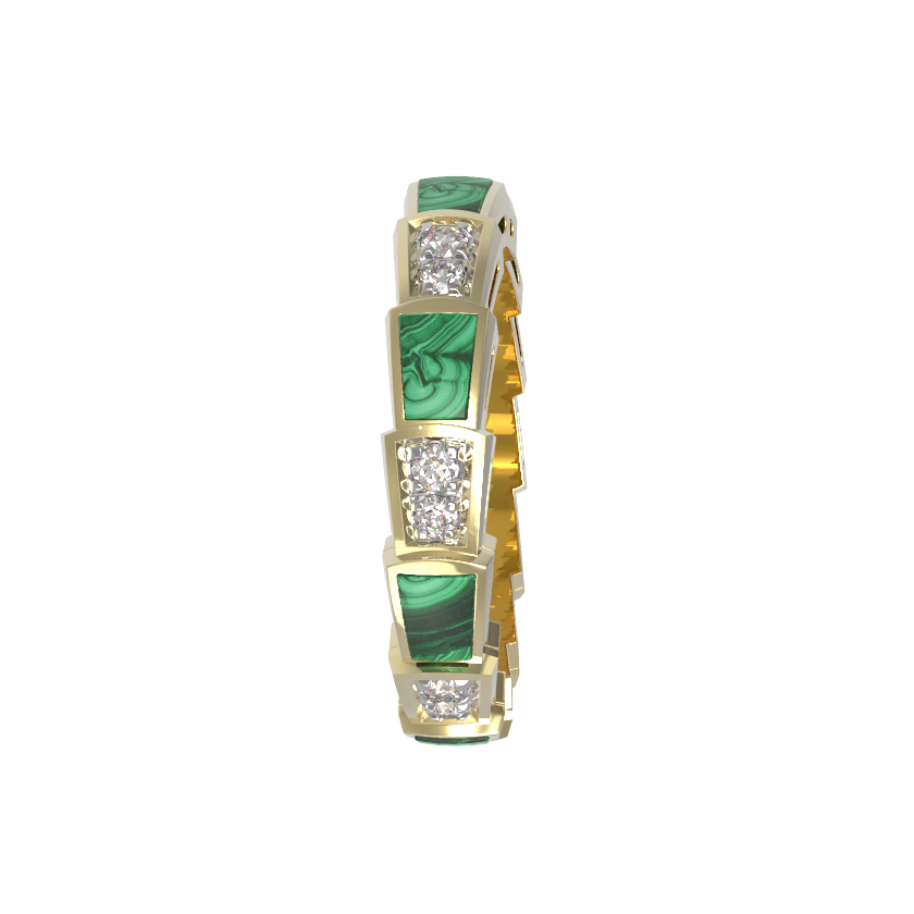 Данное кольцо украшено 21 вставкой круглой формы, которые чередуются по всему периметру шинки, создавая завораживающий контраст. Малахит с его природным уникальным узором добавляет украшению глубины, а бриллианты дарят холодный, аристократичный блеск. Такое изделие станет идеальным акцентом как в женском, так и в мужском образе, подчеркивая статус и безупречный вкус владельца.