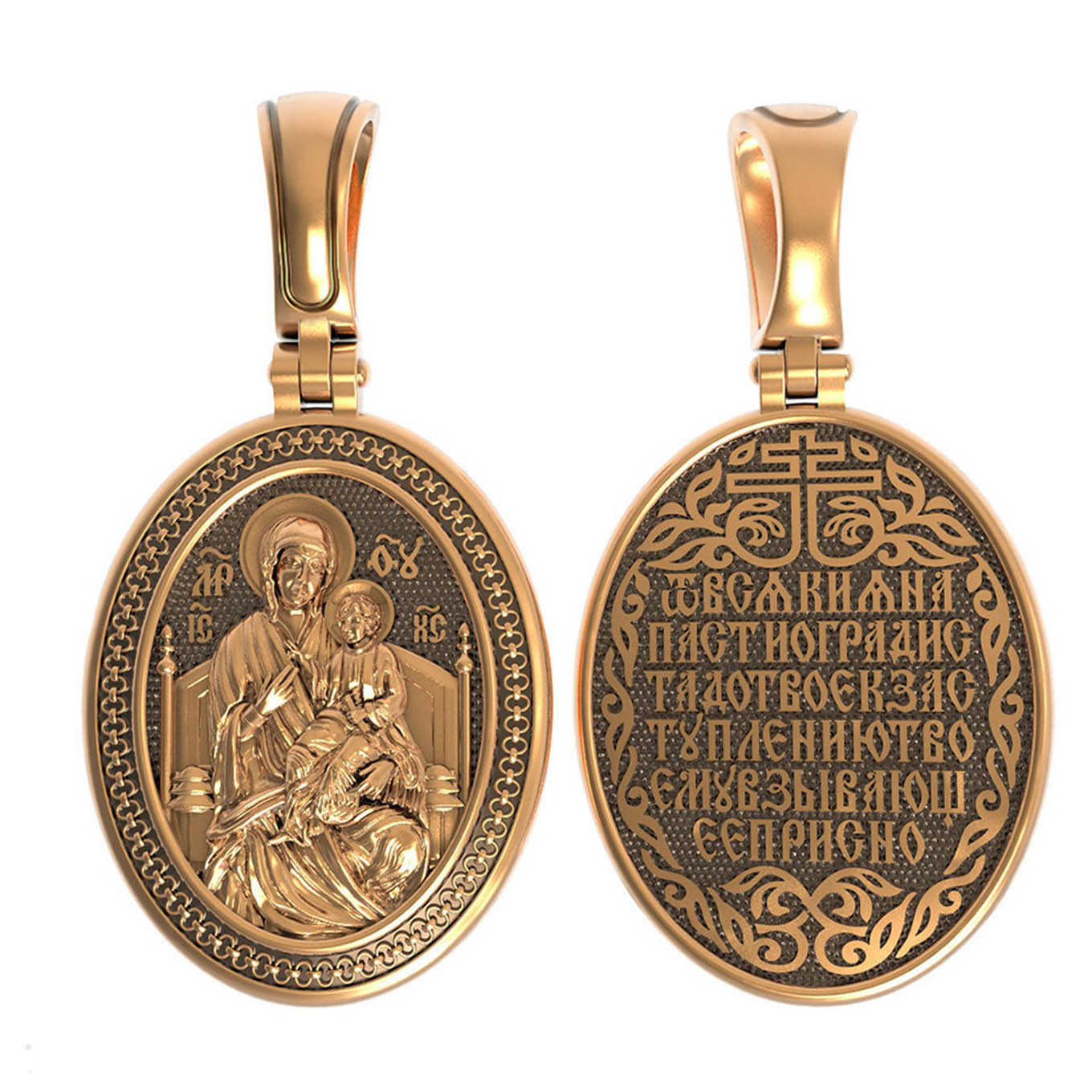 На обороте образка написана молитва Богородице в честь Ее иконы «Всецарица» (Пантанасса): «От всякия напасти огради стадо Твое, к заступлению Твоему взывающее присно».