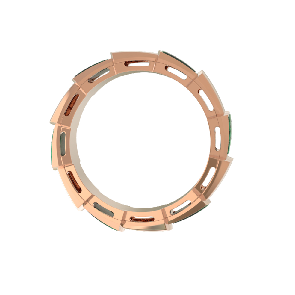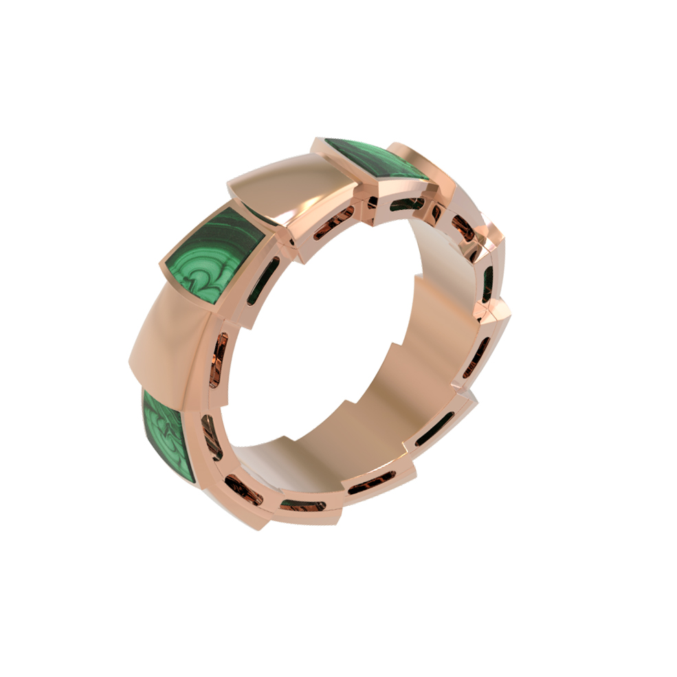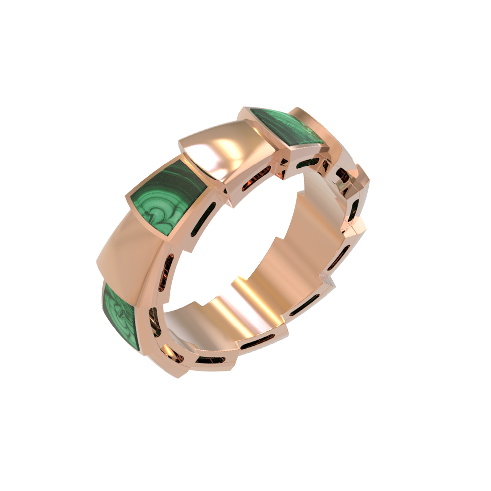 Центральным элементом декора выступает натуральный малахит глубокого зелёного цвета. В изделие инкрустировано 6 вставок, которые чередуются с гладкими золотыми звеньями, создавая интересный контраст текстур и объемов. Такое оформление делает кольцо узнаваемым и статусным аксессуаром.