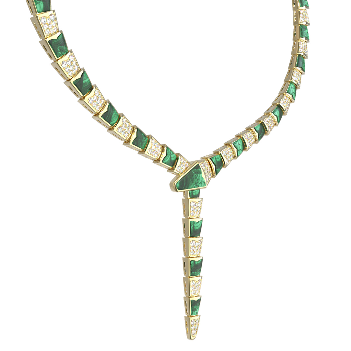 В центре композиции гармонично сочетаются насыщенный зеленый цвет малахита и ослепительное сияние бриллиантов. Всего в изделии использовано 310 вставок круглой огранки, которые создают неповторимый контраст между глубиной природного камня и блеском драгоценных кристаллов. Белые бриллианты подчеркивают холодную элегантность лимонного оттенка золота, делая украшение выразительным и статусным.