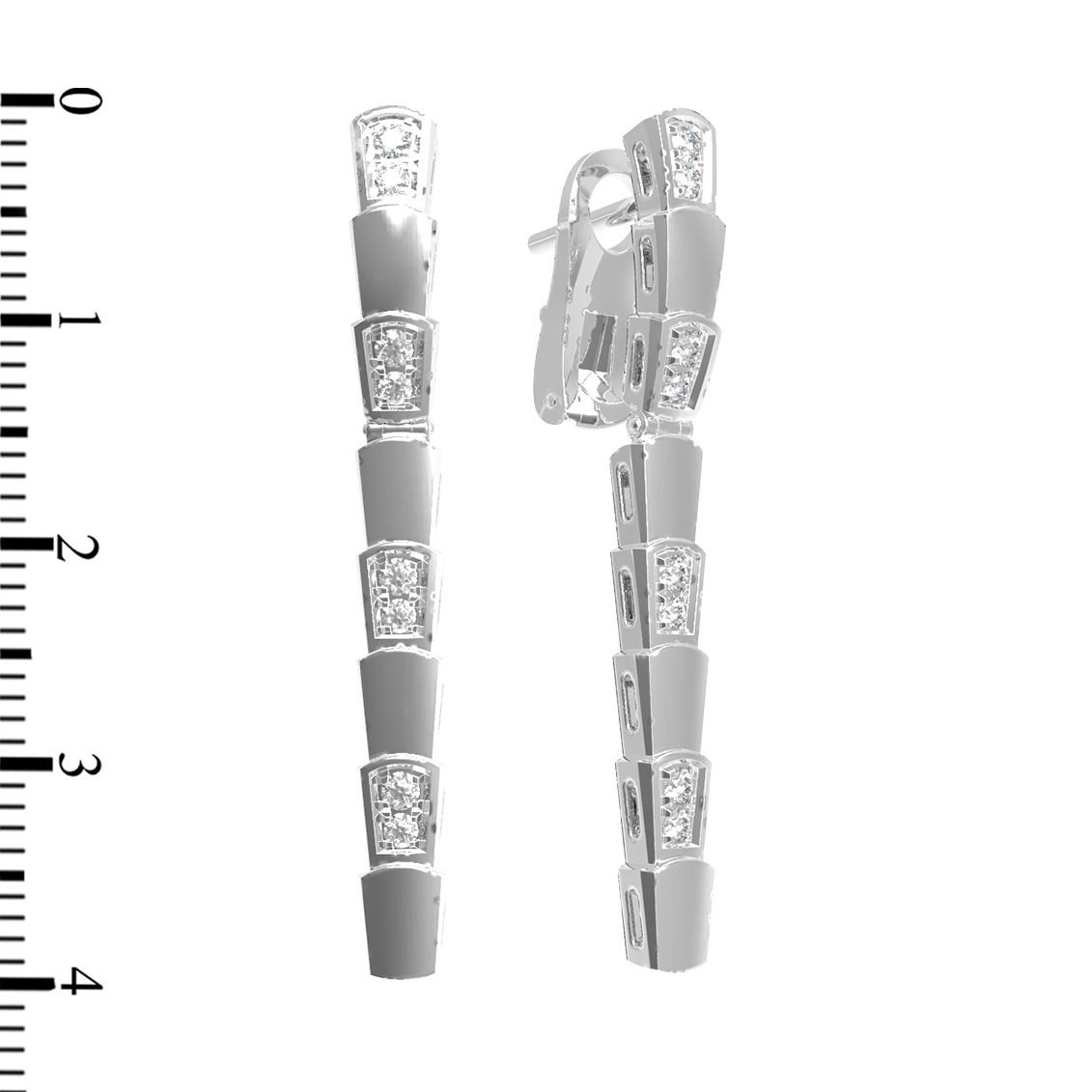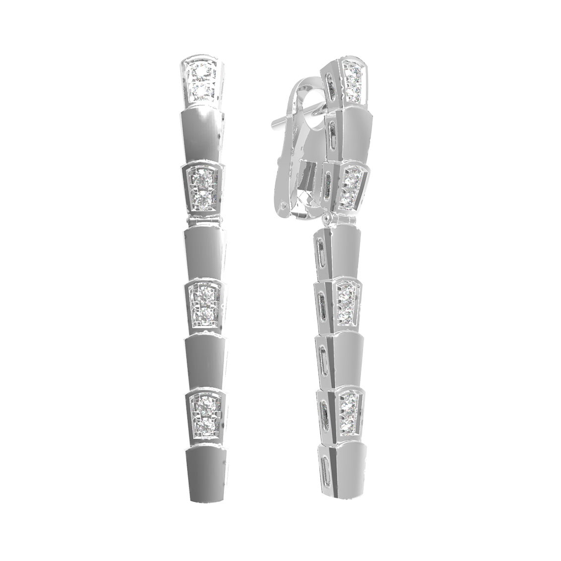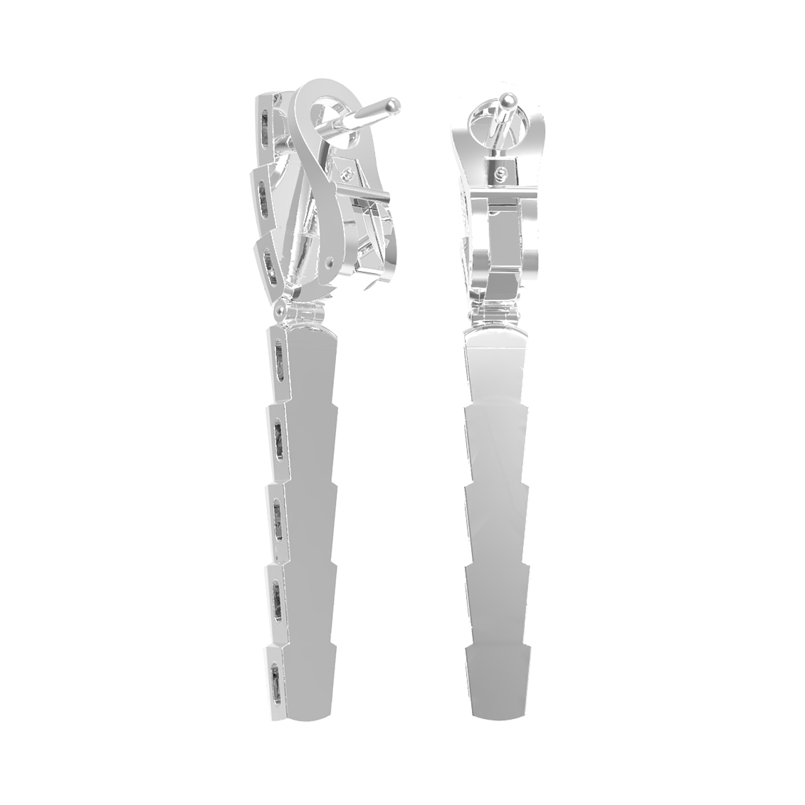 В дизайне модели использовано 16 вставок. Белые бриллианты круглой огранки расположены так, чтобы максимизировать игру света при каждом движении. Общий стиль украшения сбалансирован: лаконичные геометрические звенья сочетаются с яркими акцентами, что делает эти серьги универсальным дополнением к вечернему или деловому образу. Ювелиры уделили особое внимание чистоте линий и надежности исполнения каждой детали.