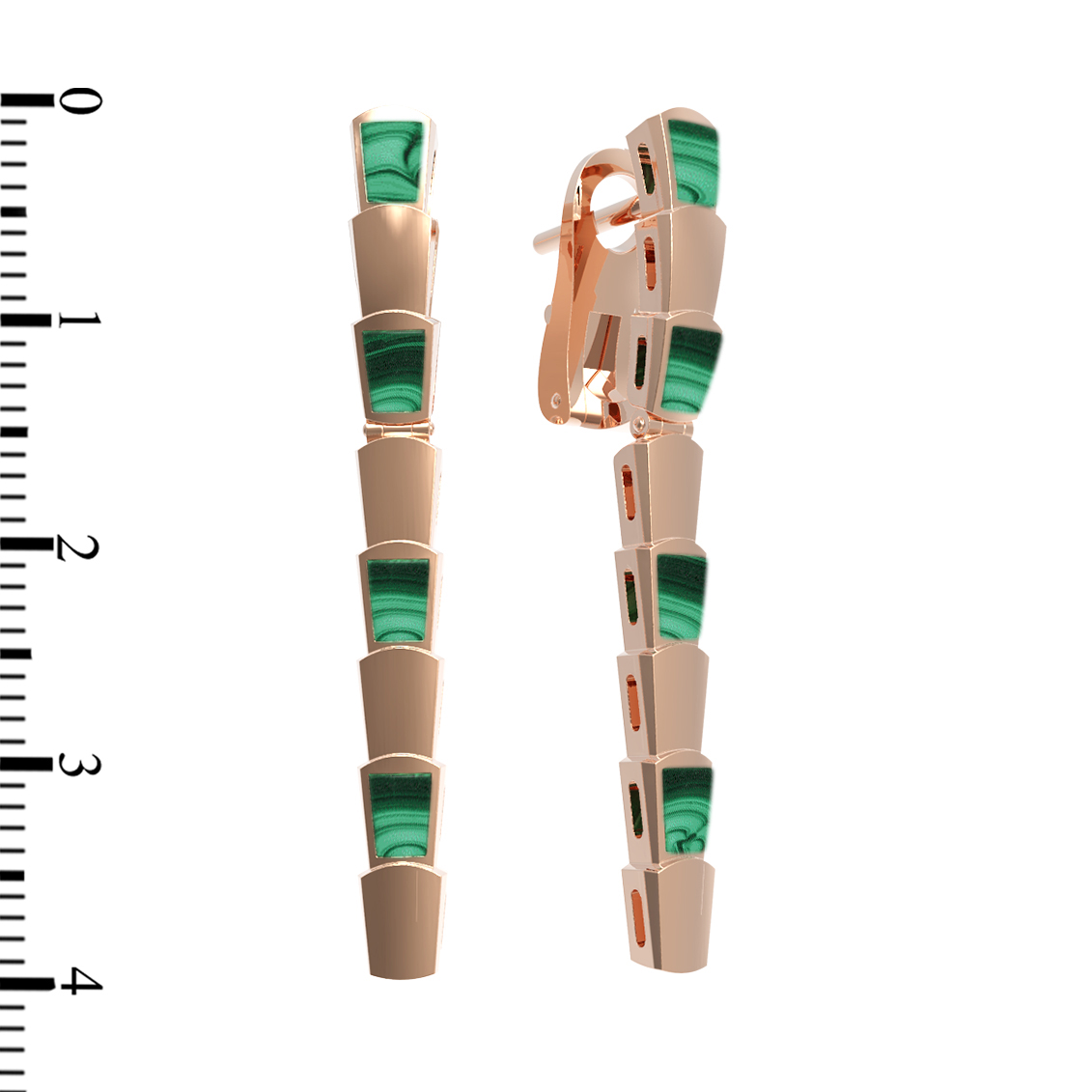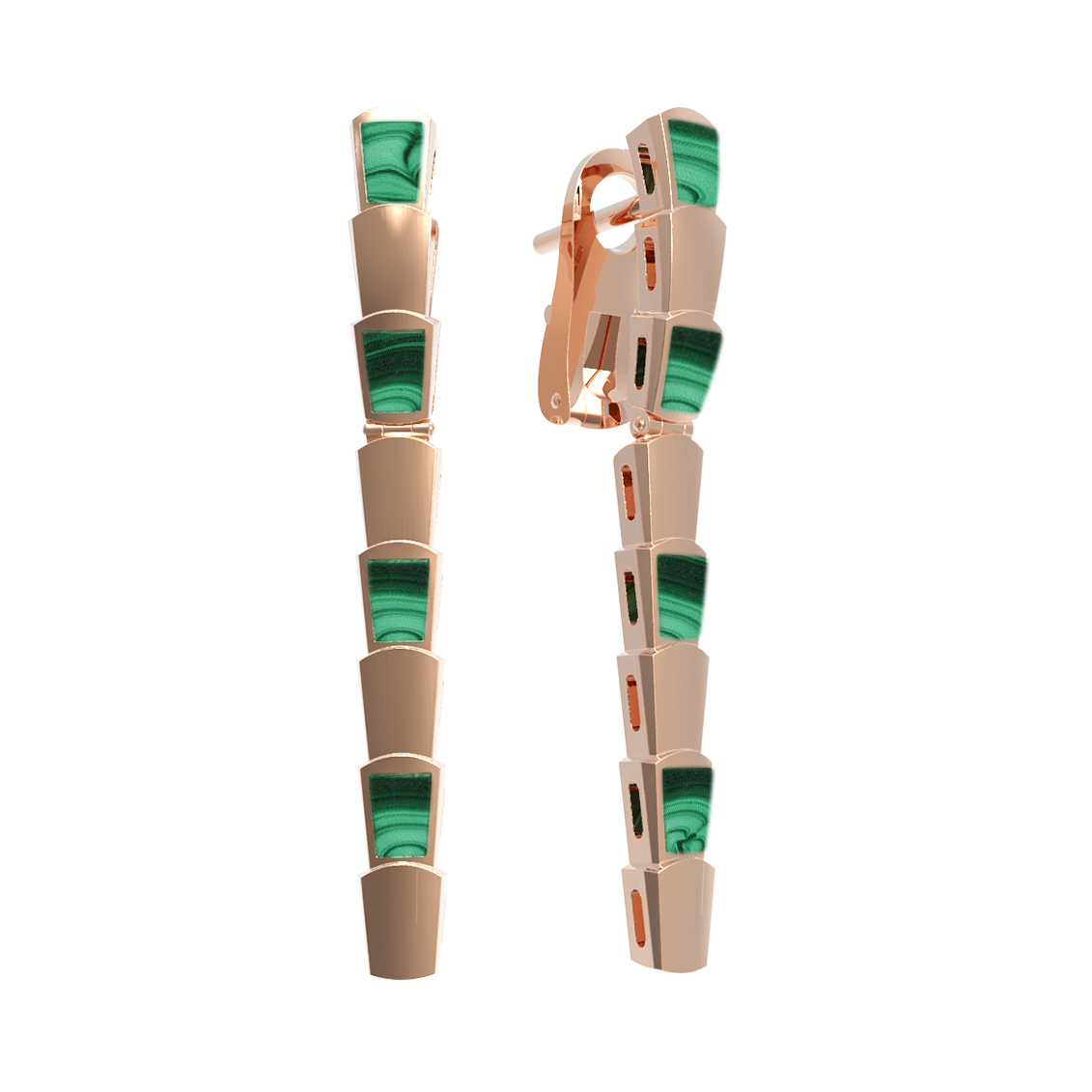 В дизайне модели гармонично сочетаются восемь малахитовых вставок, которые чередуются с золотыми сегментами, имитируя текстуру хищного существа. Эти серьги — универсальный выбор: они одинаково стильно смотрятся как на женщинах, так и на мужчинах, подчеркивая индивидуальность и вкус своего владельца. Лаконичная, но выразительная эстетика изделия делает его идеальным акцентом для вечернего образа или статусным дополнением к повседневному стилю.