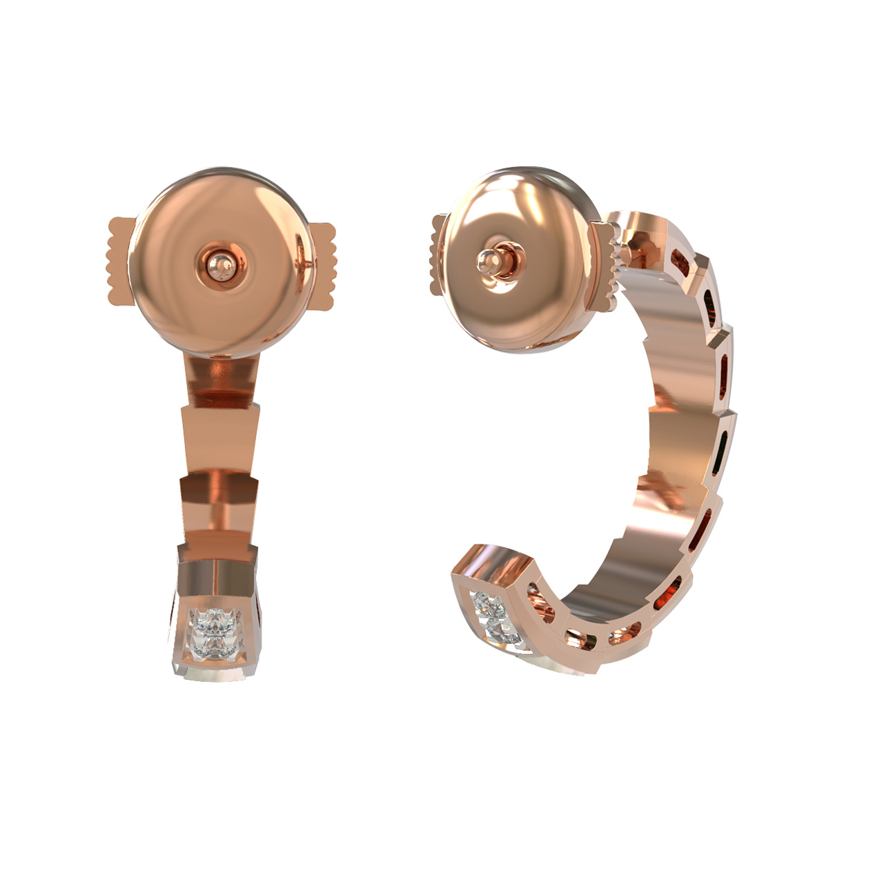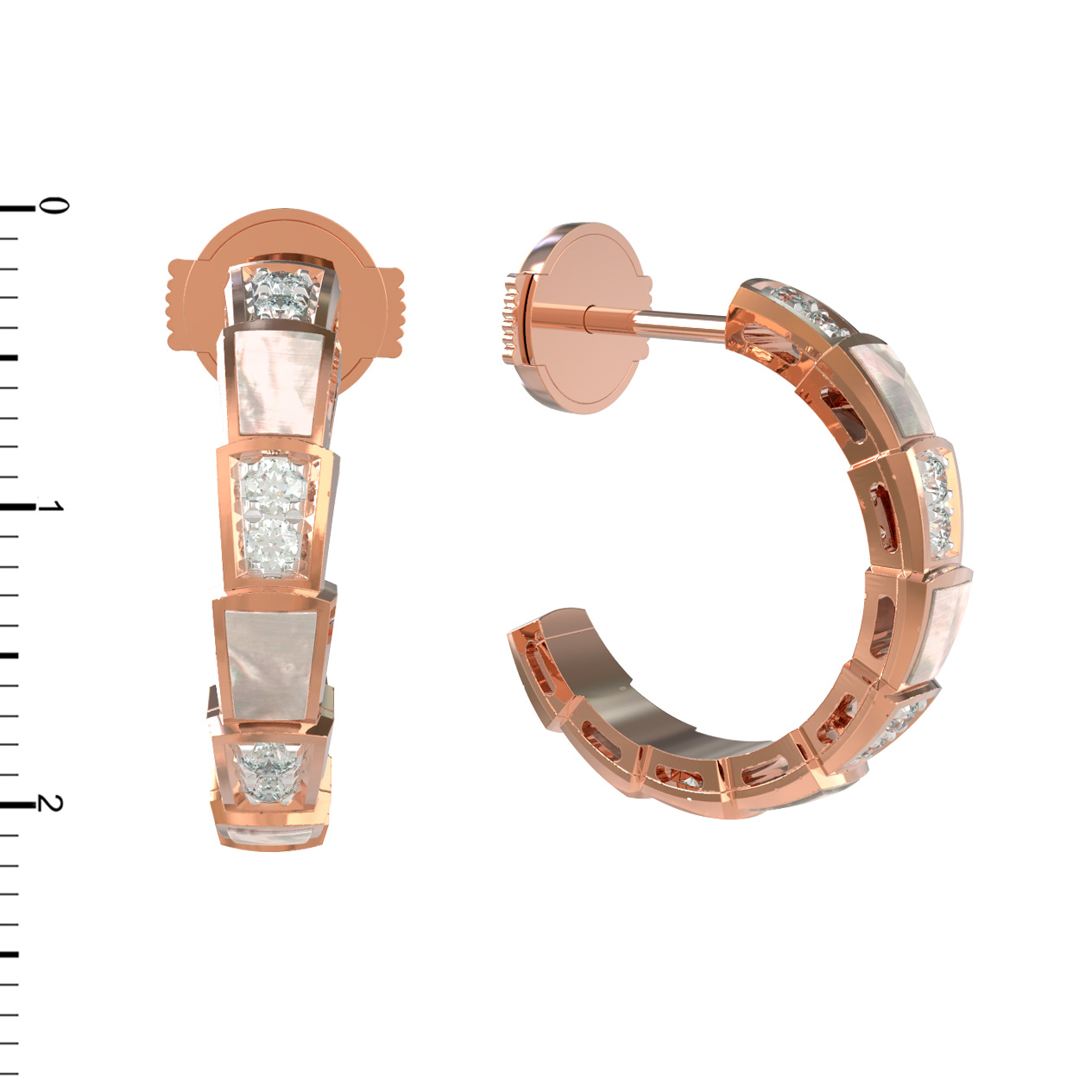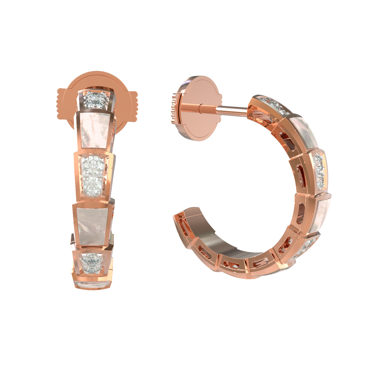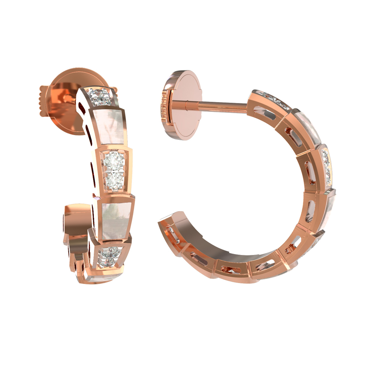 Основу композиции составляет благородное красное золото, которое великолепно оттеняет сияние 20 вставок. Дизайн украшения строится на контрастном сочетании материалов: нежный перламутр белого цвета чередуется с искристыми бриллиантами круглой формы. Такое решение создает игру света и текстур, привлекающую внимание и придающую серьгам объем и динамику. Фигурные элементы, напоминающие чешую, аккуратно инкрустированы, что делает серьги ярким акцентом в повседневном или вечернем гардеробе.