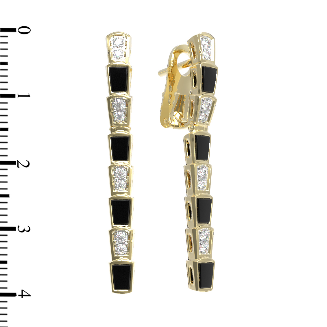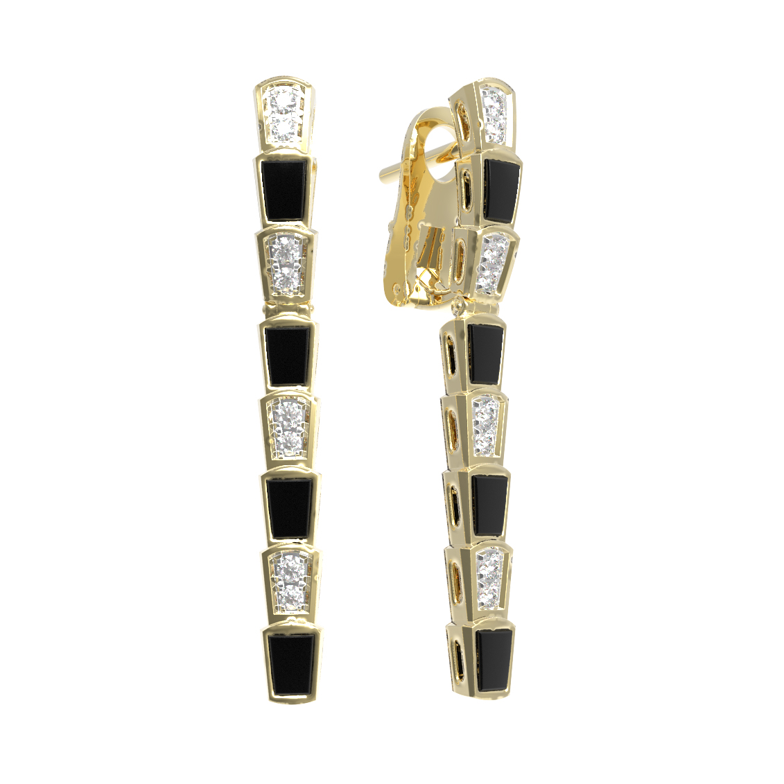 В оформлении использовано 24 вставки круглой формы — это классическое сочетание ослепительных бриллиантов белого цвета и глубокого черного оникса. Такое чередование материалов создает завораживающий визуальный эффект, добавляя образу драматизма и роскоши. Благодаря универсальной стилистике, эти серьги подходят как для женщин, так и для мужчин, предпочитающих премиальные аксессуары.