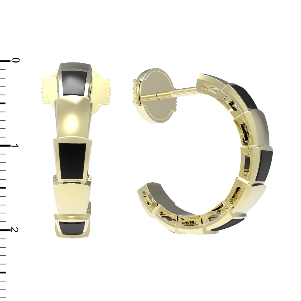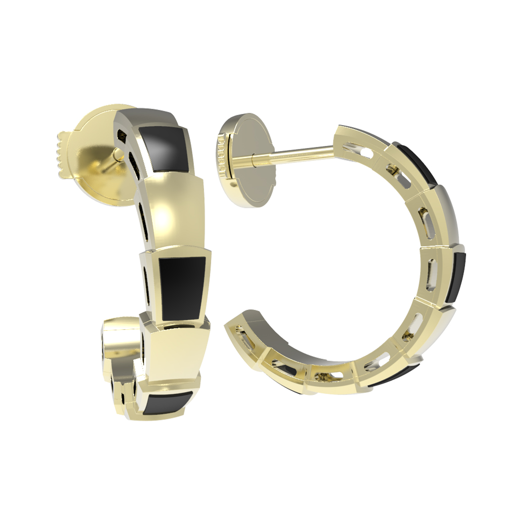 В каждой серьге расположено по 4 вставки из натурального оникса, а суммарное количество вставок в комплекте составляет 8 штук. Глубокий черный цвет вставок в сочетании с сиянием лимонного золота создает выразительный визуальный эффект, который притягивает взгляд. Лаконичная, но узнаваемая форма позволяет серьгам легко вписываться как в строгий деловой дресс-код, так и в вечерние образы. Эти серьги созданы для тех, кто ценит эстетику и смелые ювелирные решения. Модель подходит как для женщин, так и для мужчин, являясь ярким дополнением образа. Серьги из этой коллекции могут стать частью стильного комплекта, подчеркивающего вашу индивидуальность.