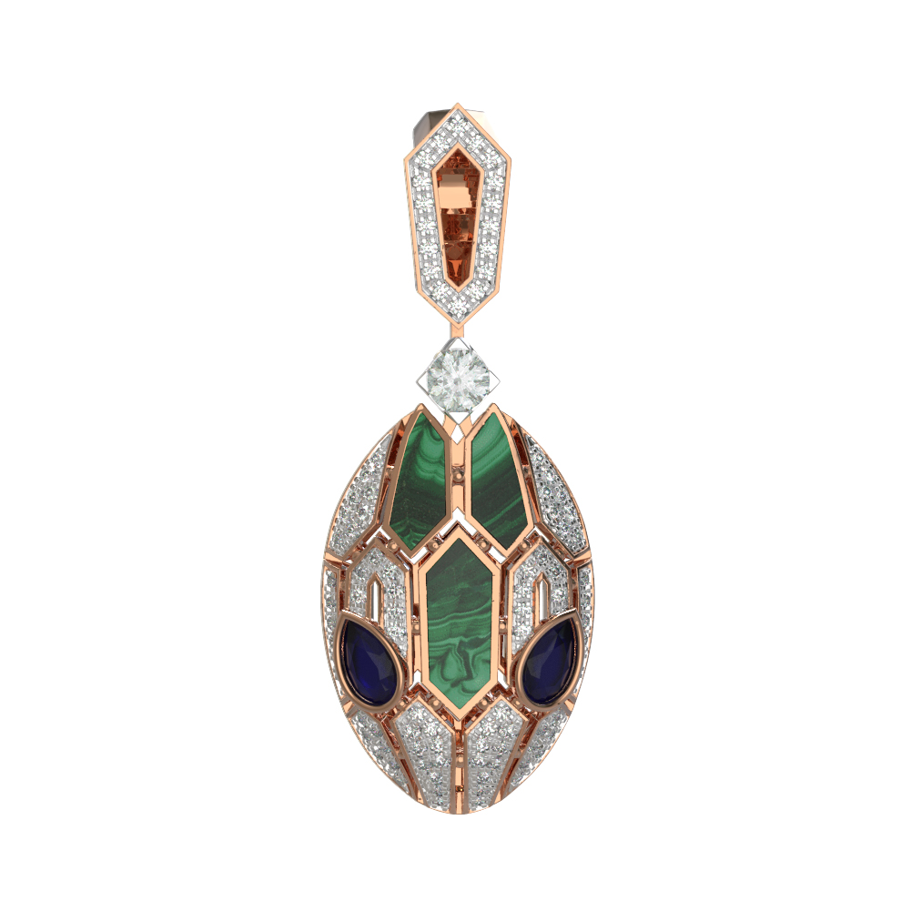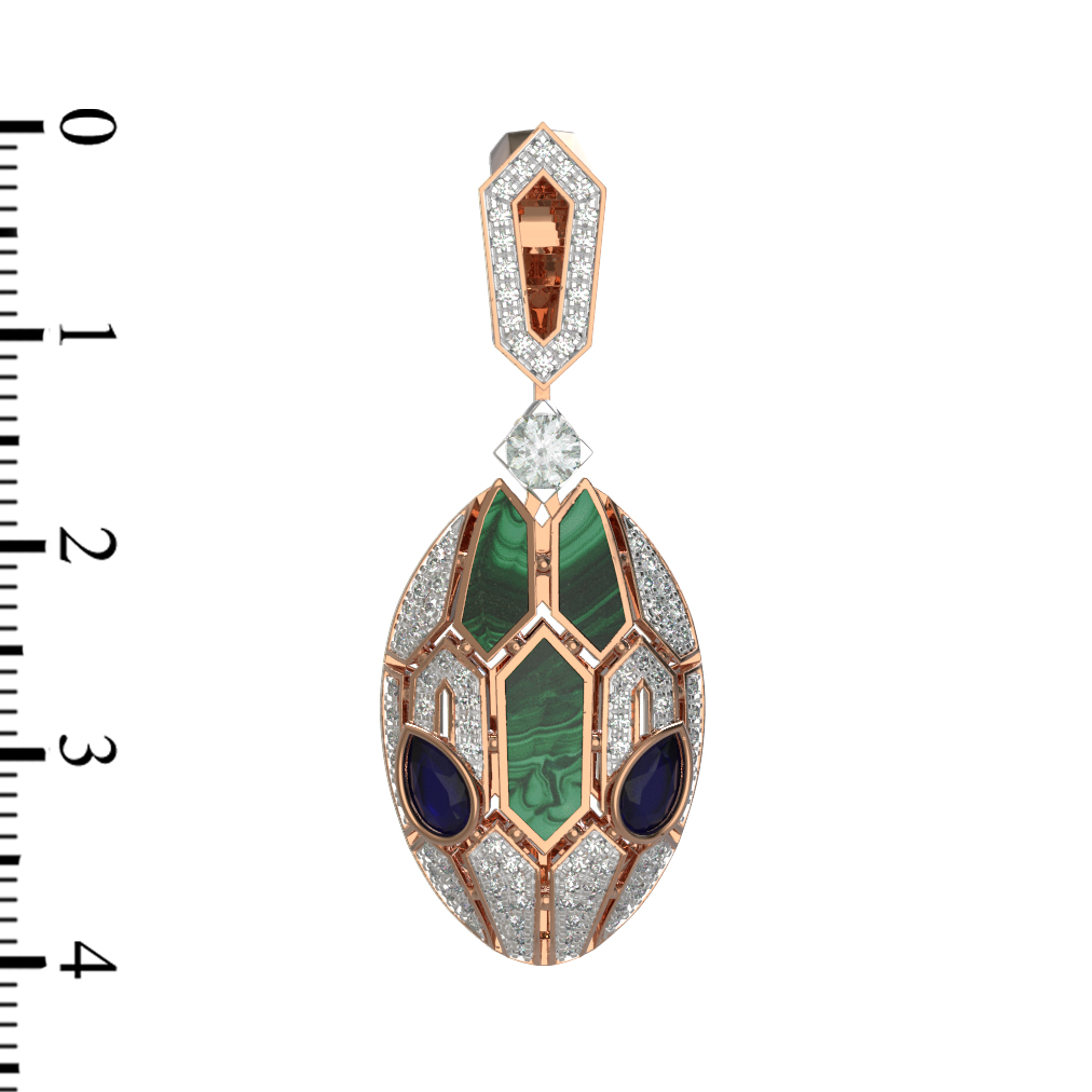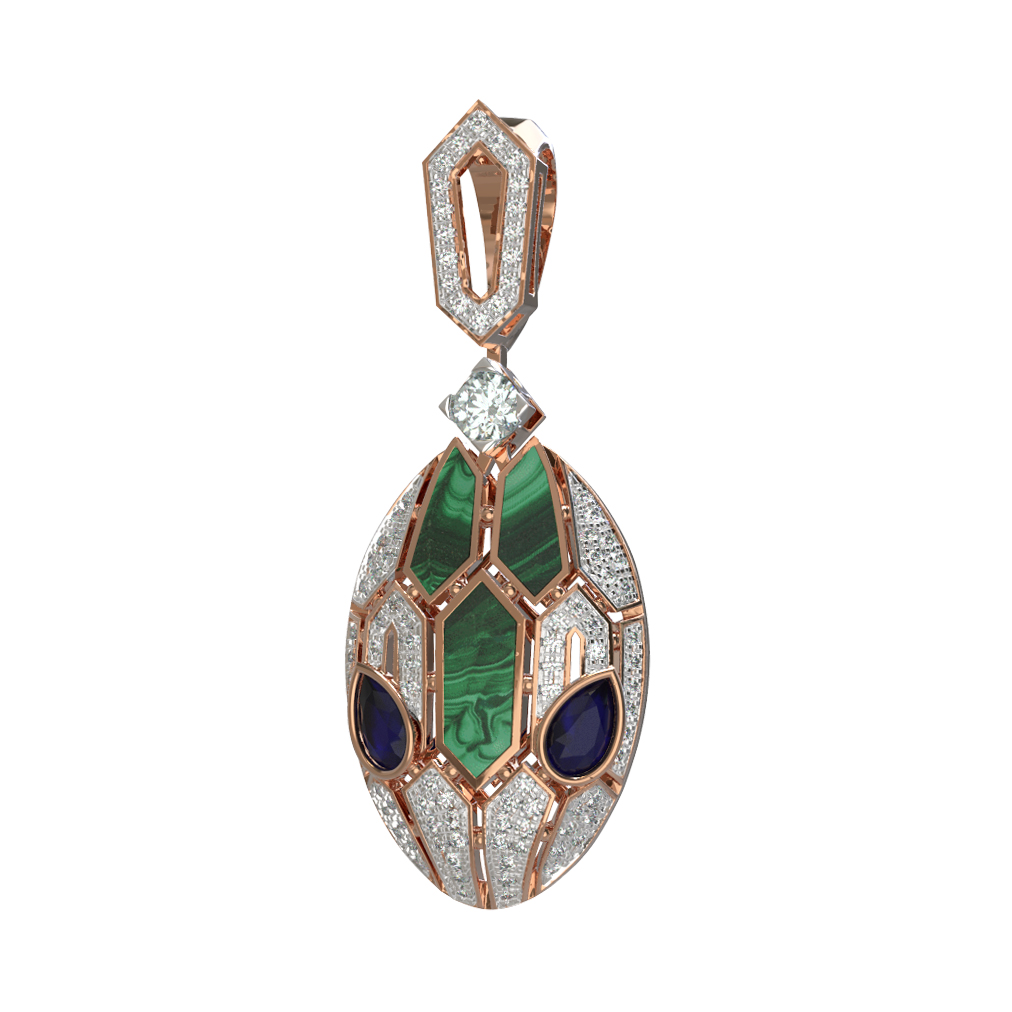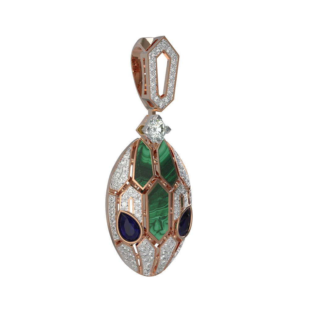 Центральная часть композиции инкрустирована малахитом насыщенного зелёного цвета, который дополняют глубокие синие сапфиры и сияющие белые бриллианты. Общее количество вставок составляет 100 штук, создавая невероятную игру света при каждом движении. Особое внимание уделено форме камней: здесь искусно сочетаются элементы огранки груша, круг и шестигранник, что придает подвеске динамику и особую архитектурную выразительность. Сложная детализация в стиле скорпиона подчеркивает премиальный статус изделия.