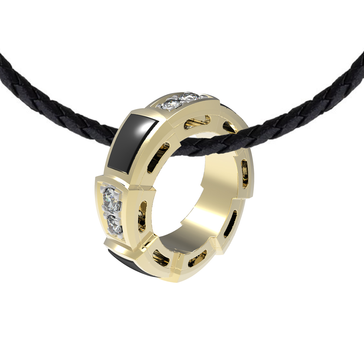 Основу композиции составляет благородное лимонное золото, чей теплый оттенок идеально гармонирует с глубоким черным цветом вставок из оникса. Элегантную игру света обеспечивают 12 вставок из чистых бриллиантов круглой формы, которые мягко мерцают, подчеркивая статусность украшения. Белоснежный блеск бриллиантов создаёт драматичный контраст с темным ониксом, превращая подвеску в произведение ювелирного искусства.