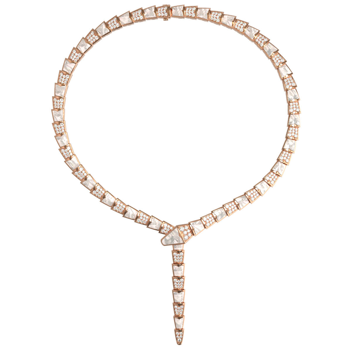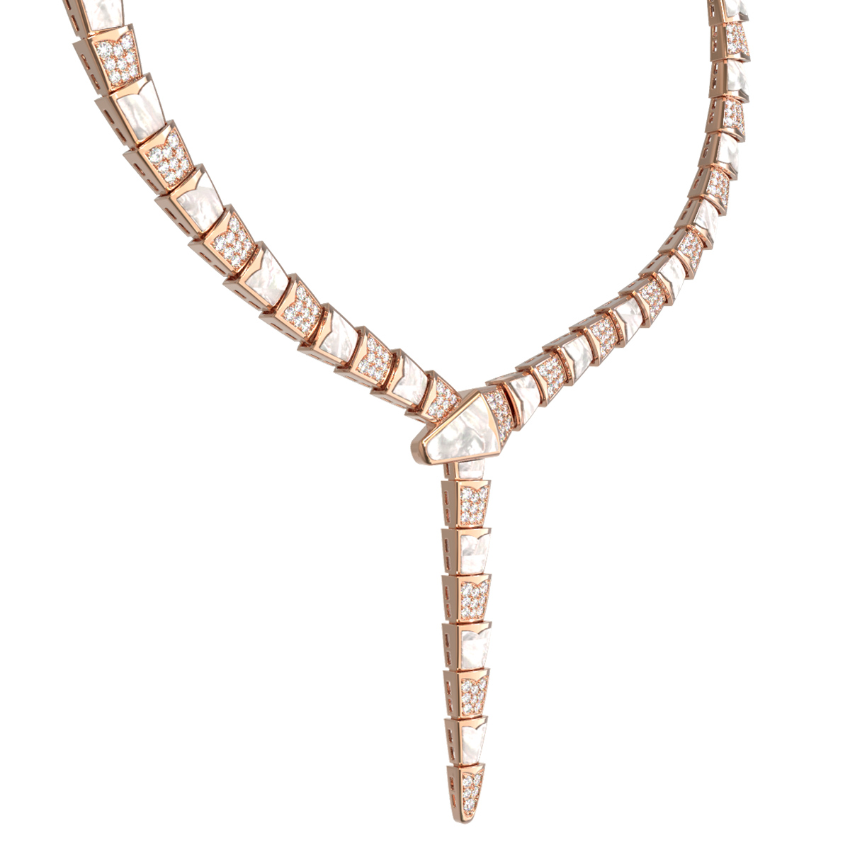 Роскошь и блеск этому аксессуару придают 278 вставок, искусно инкрустированных в структуру колье. Сочетание сверкающих бриллиантов круглой огранки и нежного переливчатого перламутра создает изысканный контраст. Белоснежные перламутровые элементы и прозрачные бриллианты образуют завораживающую игру света, подчеркивая статусность украшения. Детали дизайна, имитирующие фактуру змеиной кожи, превращают это колье в настоящее произведение искусства.