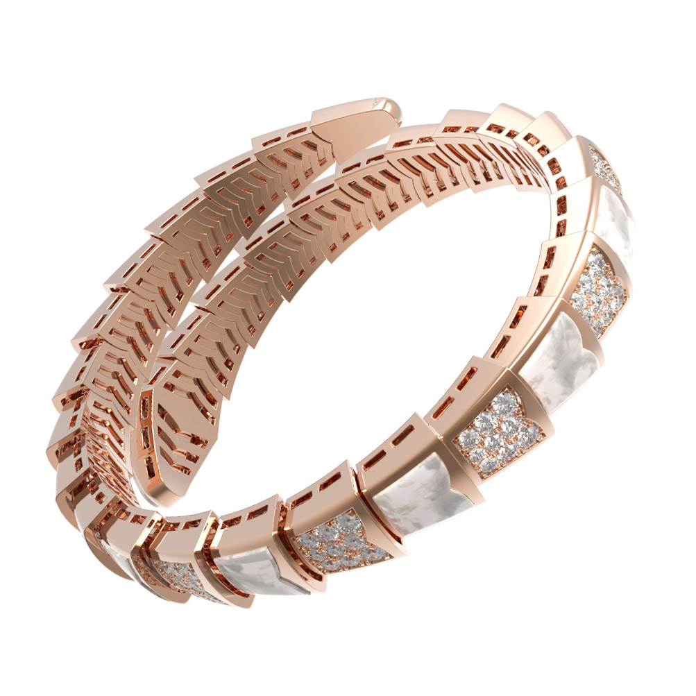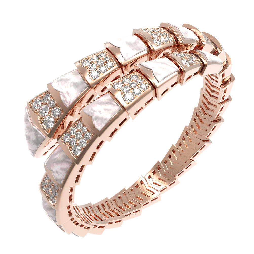 Особую изысканность браслету придает сочетание вставок: сияющие бриллианты круглой формы соседствуют с нежным перламутром. Всего в изделии использовано 384 вставки, которые создают неповторимую игру света и контраст между белым блеском драгоценных камней и мягким сиянием перламутровых пластин. Такая композиция делает браслет универсальным аксессуаром, который одинаково эффектно дополнит как женский, так и мужской образ.