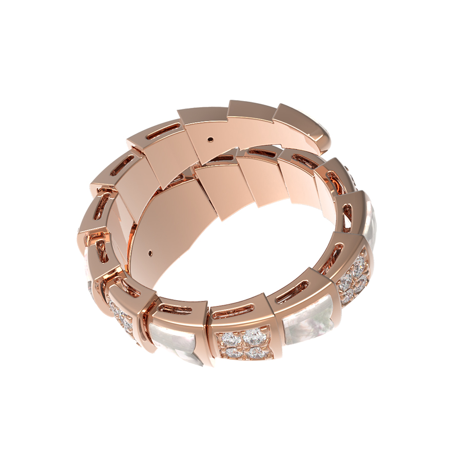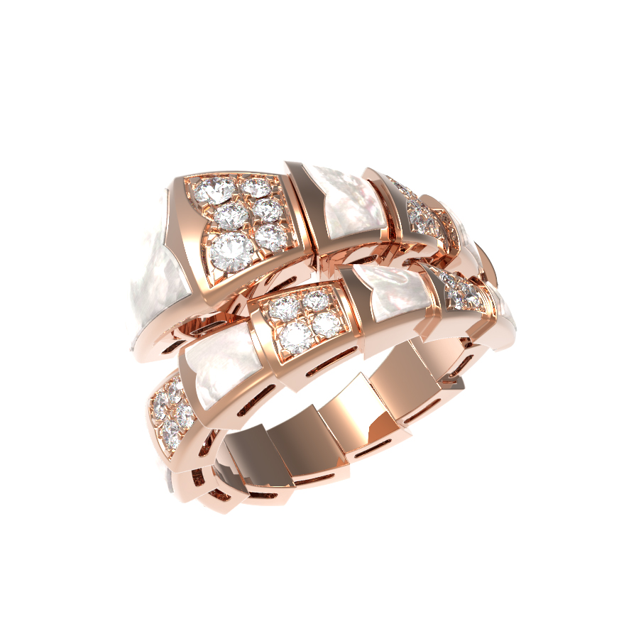 Декор изделия поражает своей детализацией: чередование вставок из нежного перламутра и сверкающих бриллиантов создает уникальную игру света и текстур. Всего в изделии использовано 388 вставок круглой формы, где белые бриллианты соседствуют с мягким перламутровым блеском, придавая украшению глубину и премиальный вид. Это универсальный аксессуар: кольцо подходит как для женщин, так и для мужчин, подчеркивая статус и индивидуальный стиль владельца.