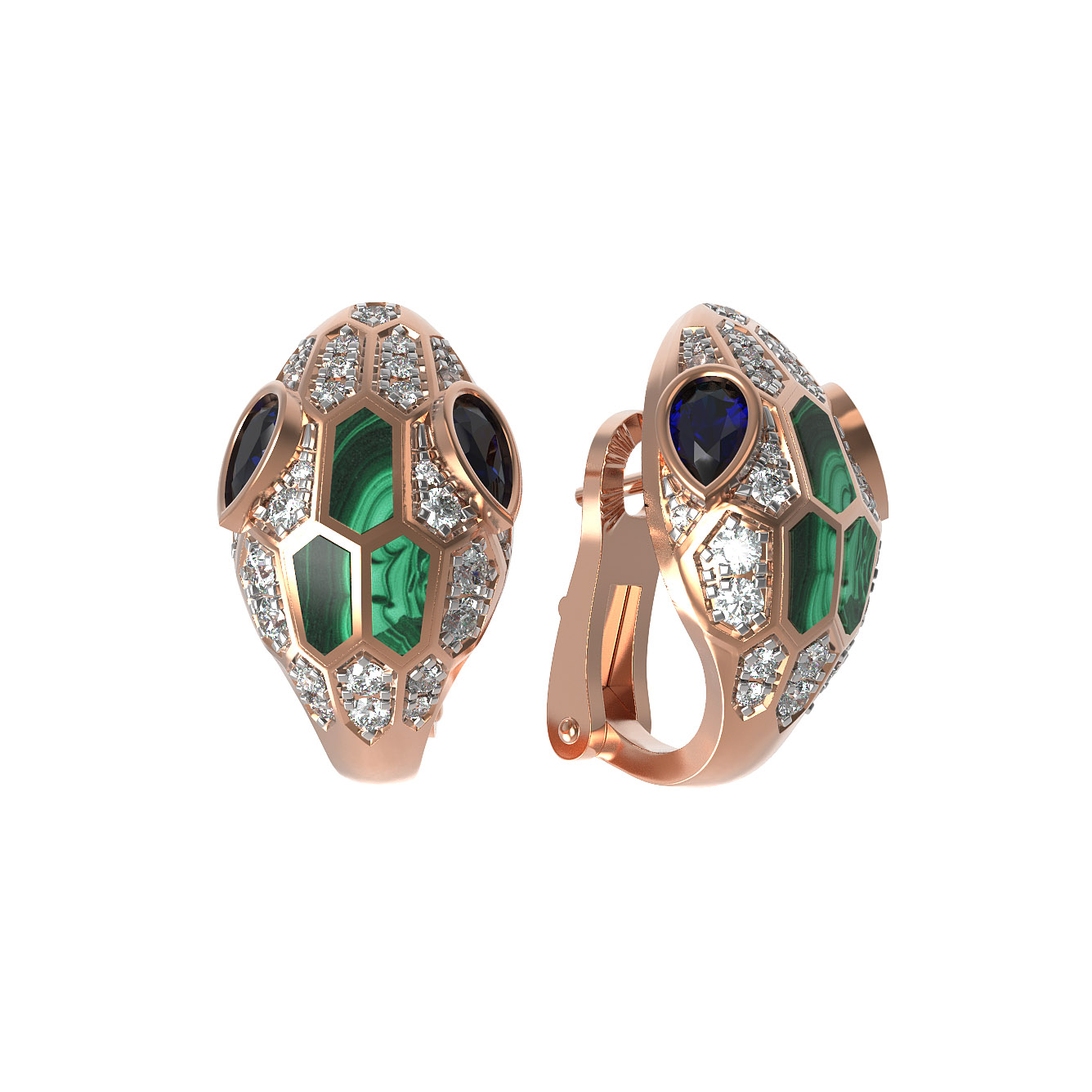 Композиция инкрустирована 64 вставками, среди которых сияющие бриллианты белого цвета, насыщенный малахит зеленого оттенка и глубокие синие сапфиры. Игра форм — круглая, грушевидная и шестигранная — создает сложную текстуру, напоминающую природный орнамент, который притягивает взгляд. Эти серьги из красного золота гармонично дополнят вечерний или деловой ансамбль, а также могут стать частью изысканного комплекта, подчеркивающего вашу индивидуальность. Сочетание благородных материалов и дерзкого дизайна делает это украшение желанным подарком для ценителей эксклюзивных аксессуаров с характером.