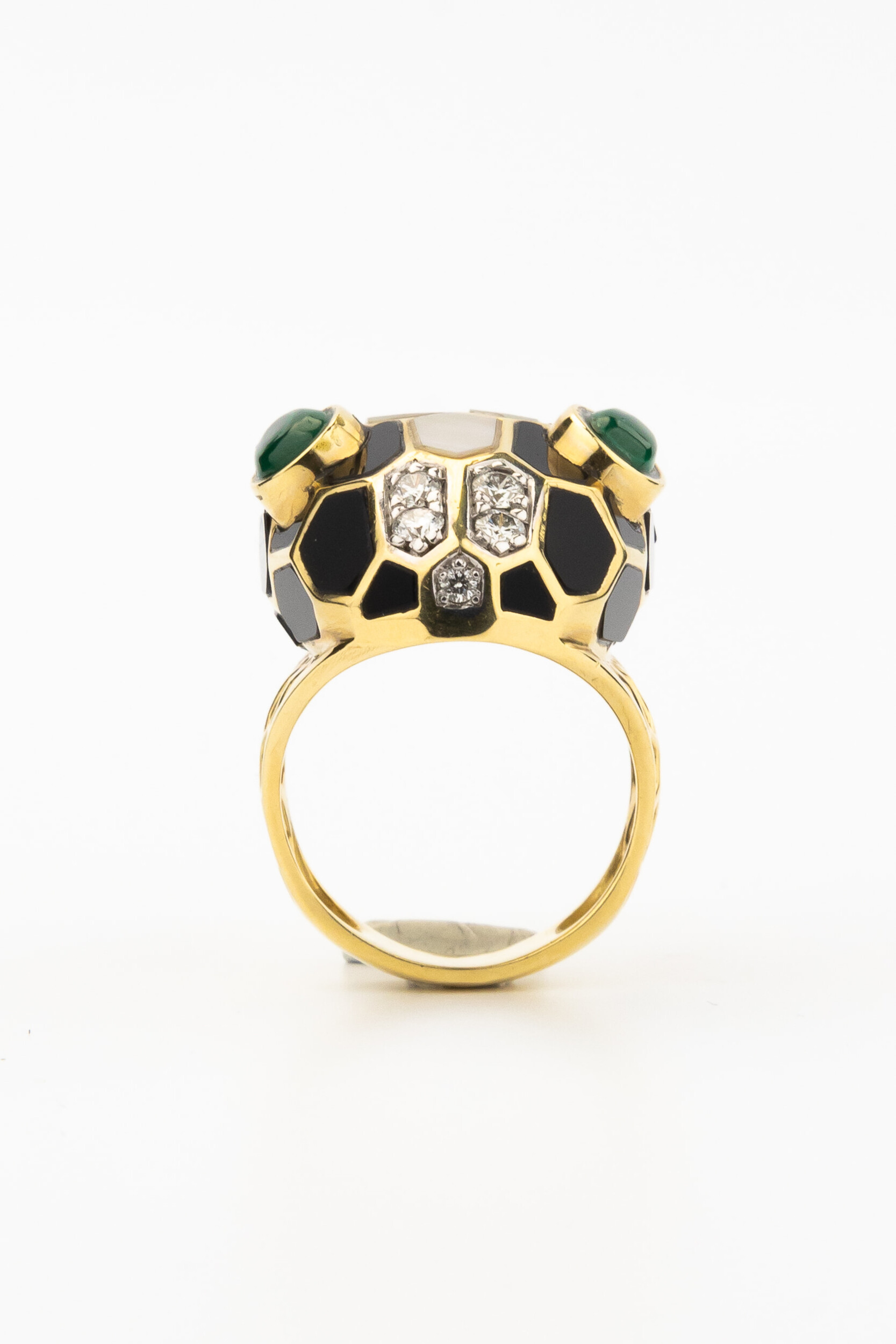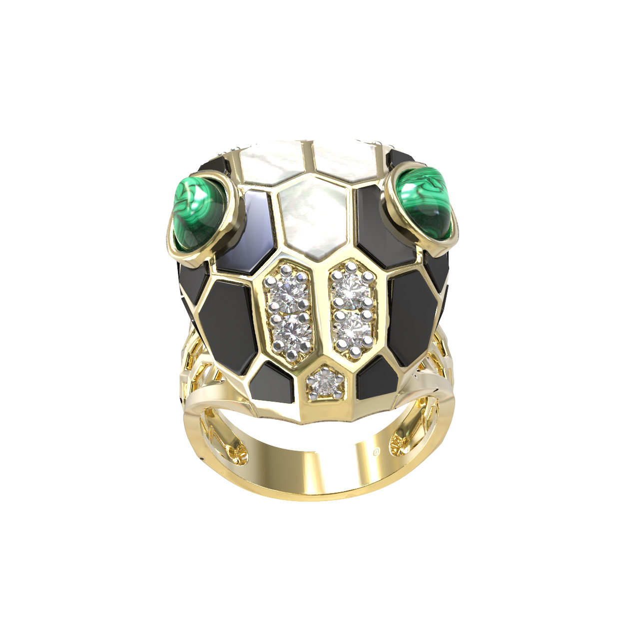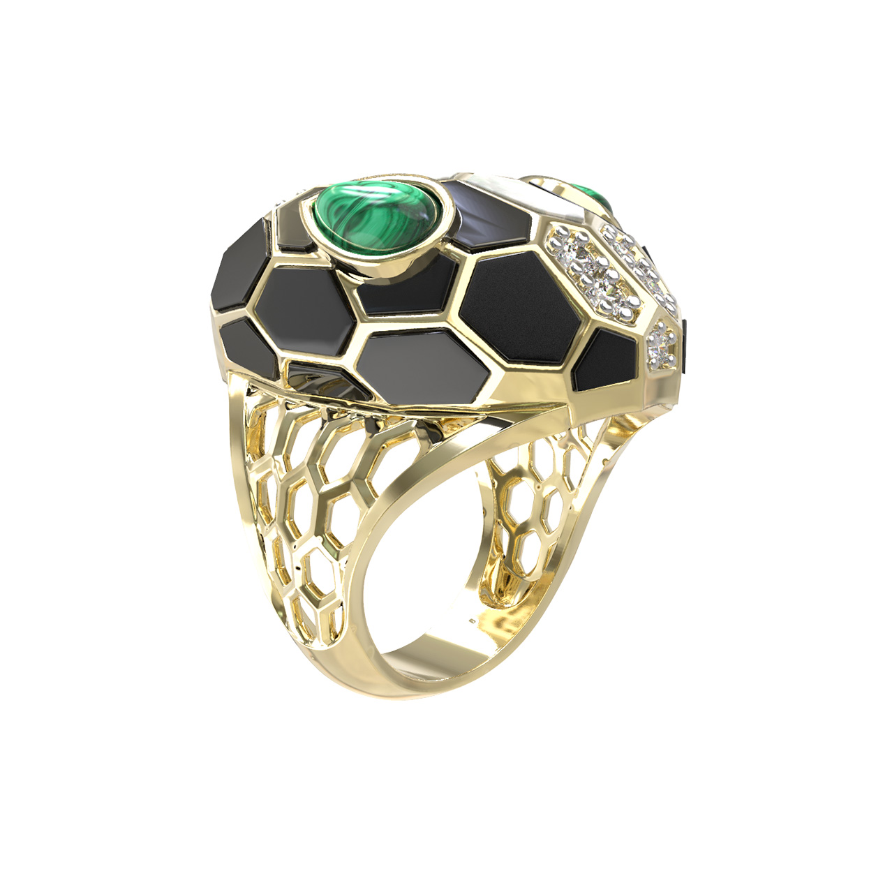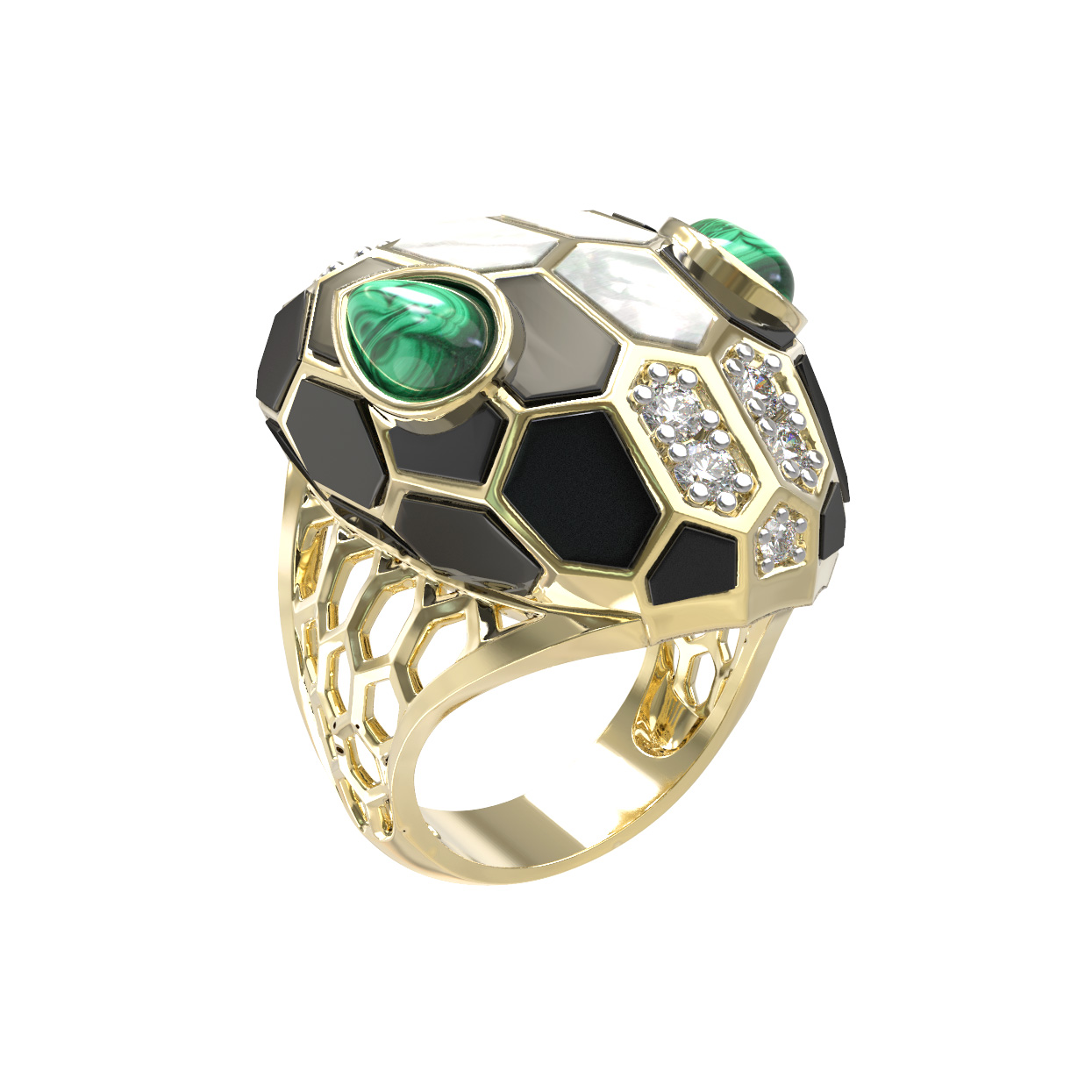 Кольцо из лимонного золота c бриллиантами, рубином, ониксом, малахитом и перламутром