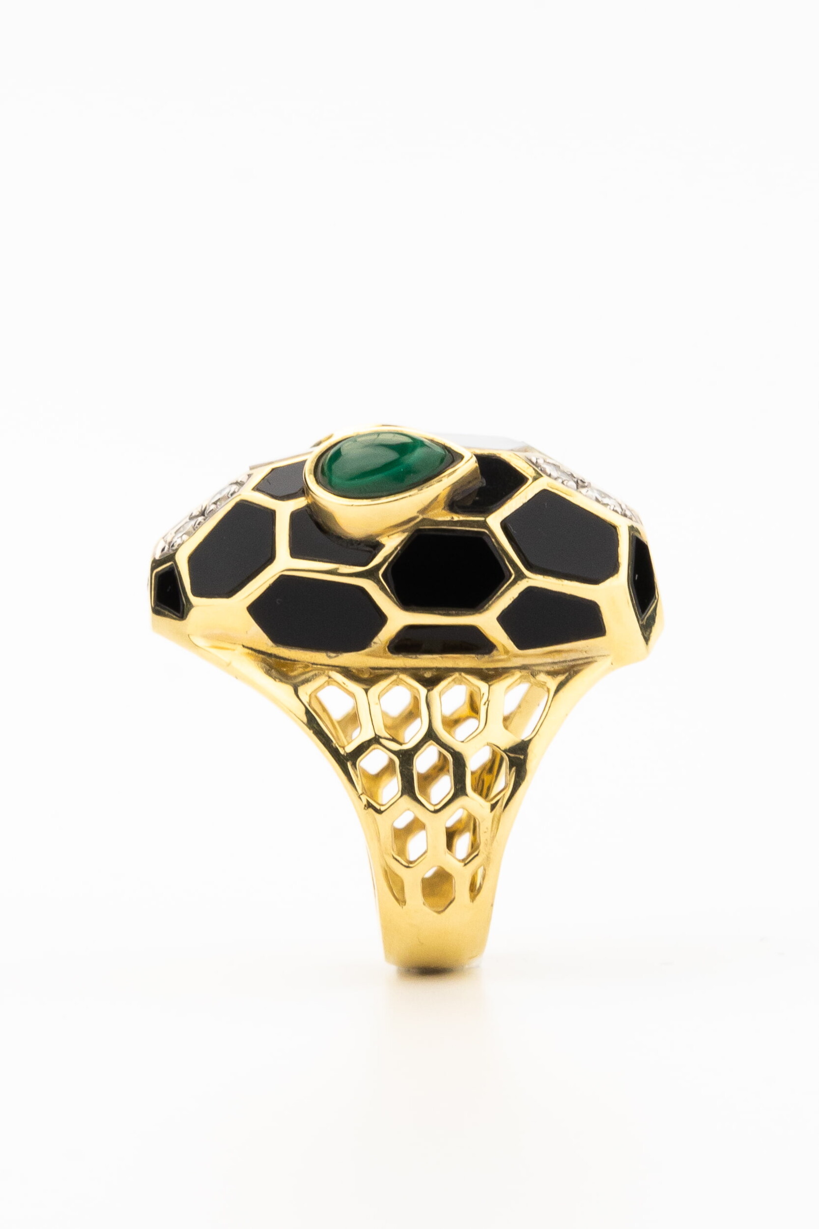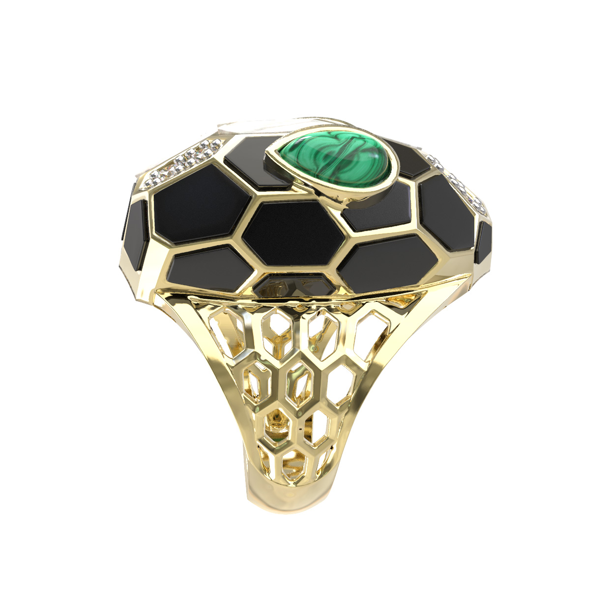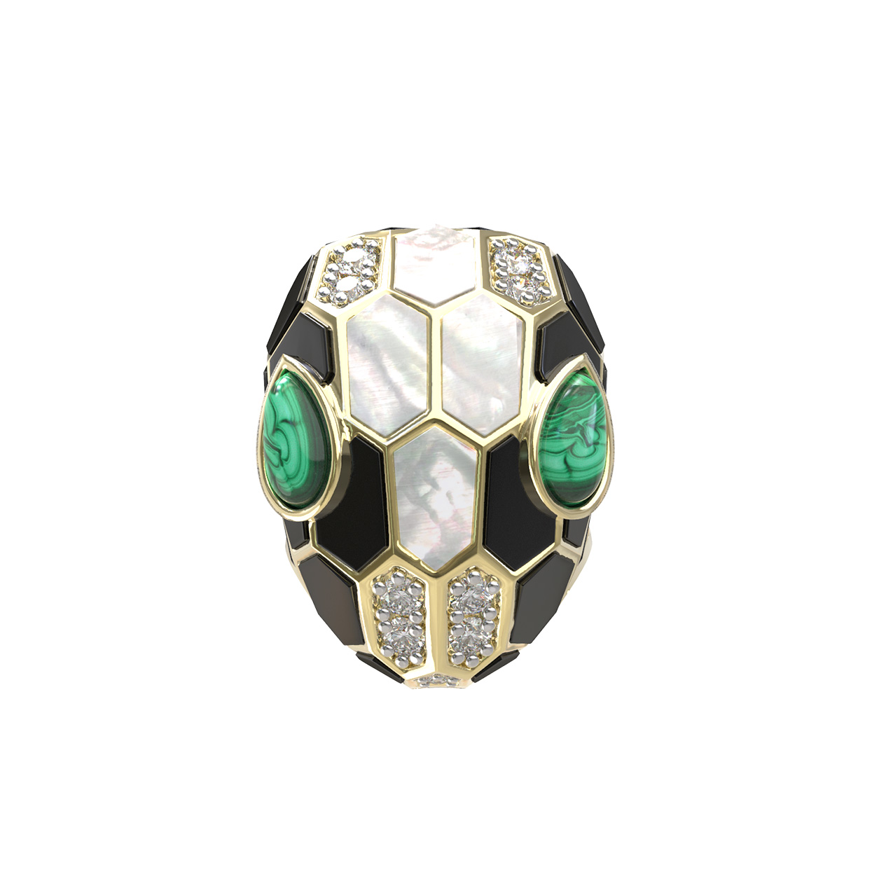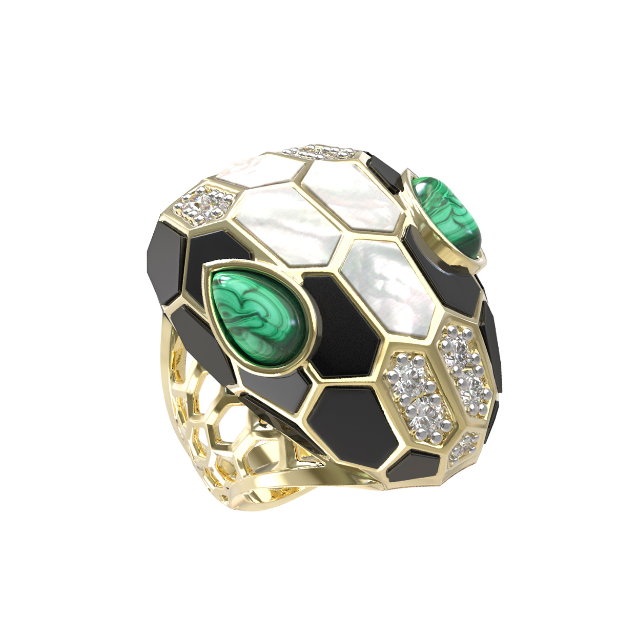 В центре композиции — искусное сочетание вставок. Глубокий зеленый цвет малахита соседствует с лаконичным черным ониксом и нежным сиянием перламутра, создавая эффектный контраст. Использование камней формы груша и круг подчеркивает динамику линий. Роскошь изделия дополняют 36 бриллиантов, которые добавляют блеска и благородства лимонному золоту. Цветовая палитра вставок включает белый, зеленый, красный, перламутровый и черный оттенки, что делает кольцо невероятно вариативным в сочетаниях.