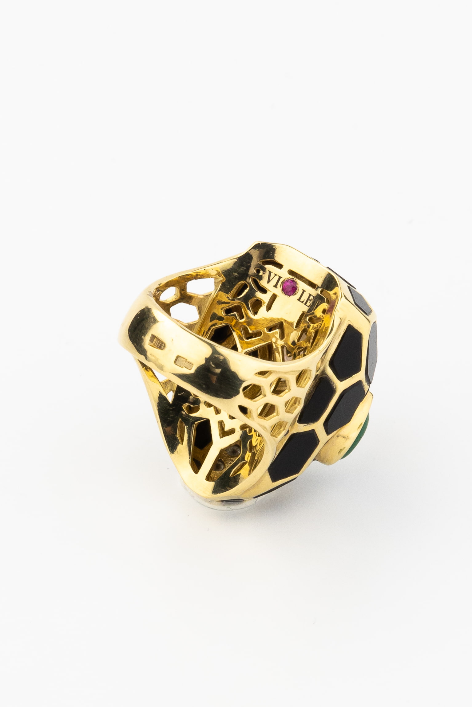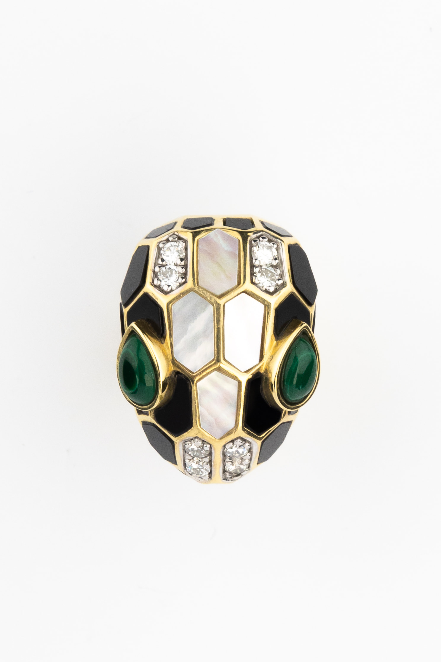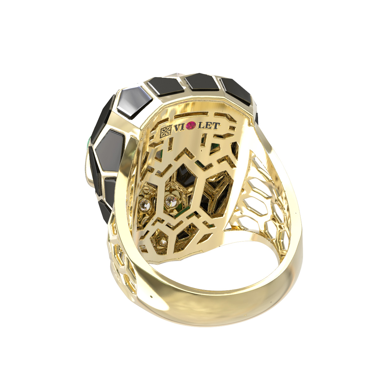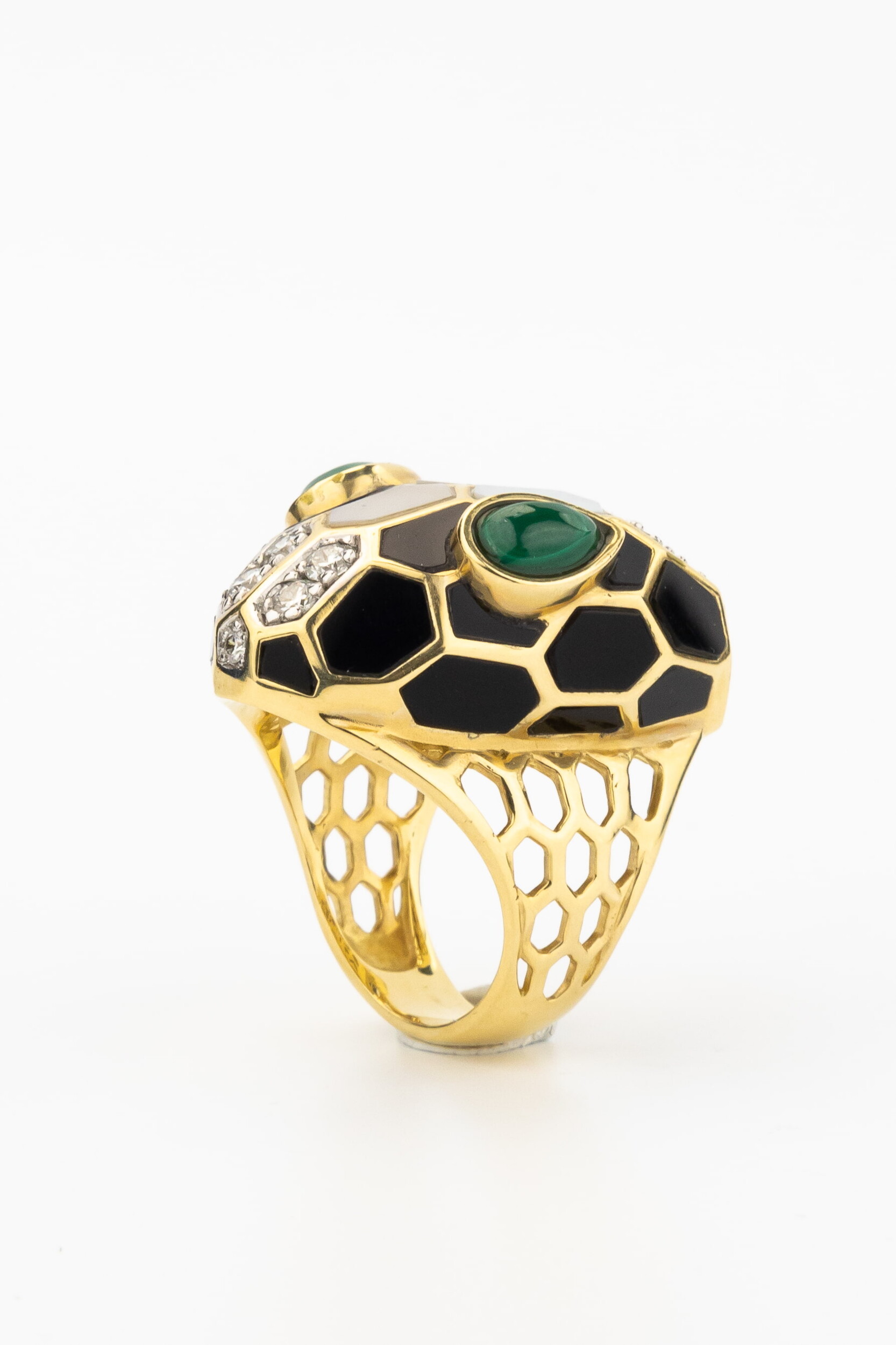 В центре композиции — искусное сочетание вставок. Глубокий зеленый цвет малахита соседствует с лаконичным черным ониксом и нежным сиянием перламутра, создавая эффектный контраст. Использование камней формы груша и круг подчеркивает динамику линий. Роскошь изделия дополняют 36 бриллиантов, которые добавляют блеска и благородства лимонному золоту. Цветовая палитра вставок включает белый, зеленый, красный, перламутровый и черный оттенки, что делает кольцо невероятно вариативным в сочетаниях.