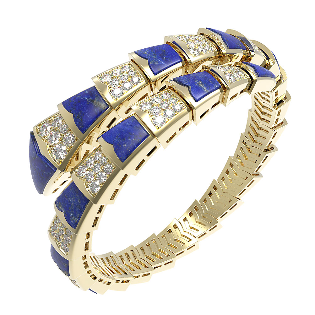 Особую выразительность украшению придает сочетание насыщенного синего лазурита и ослепительного блеска бриллиантов. Использование 432 круглых вставок превращает аксессуар в настоящее произведение ювелирного искусства, притягивающее восхищенные взгляды. Белые бриллианты создают яркую игру света, в то время как глубокий синий цвет лазурита добавляет глубины и мистического очарования.