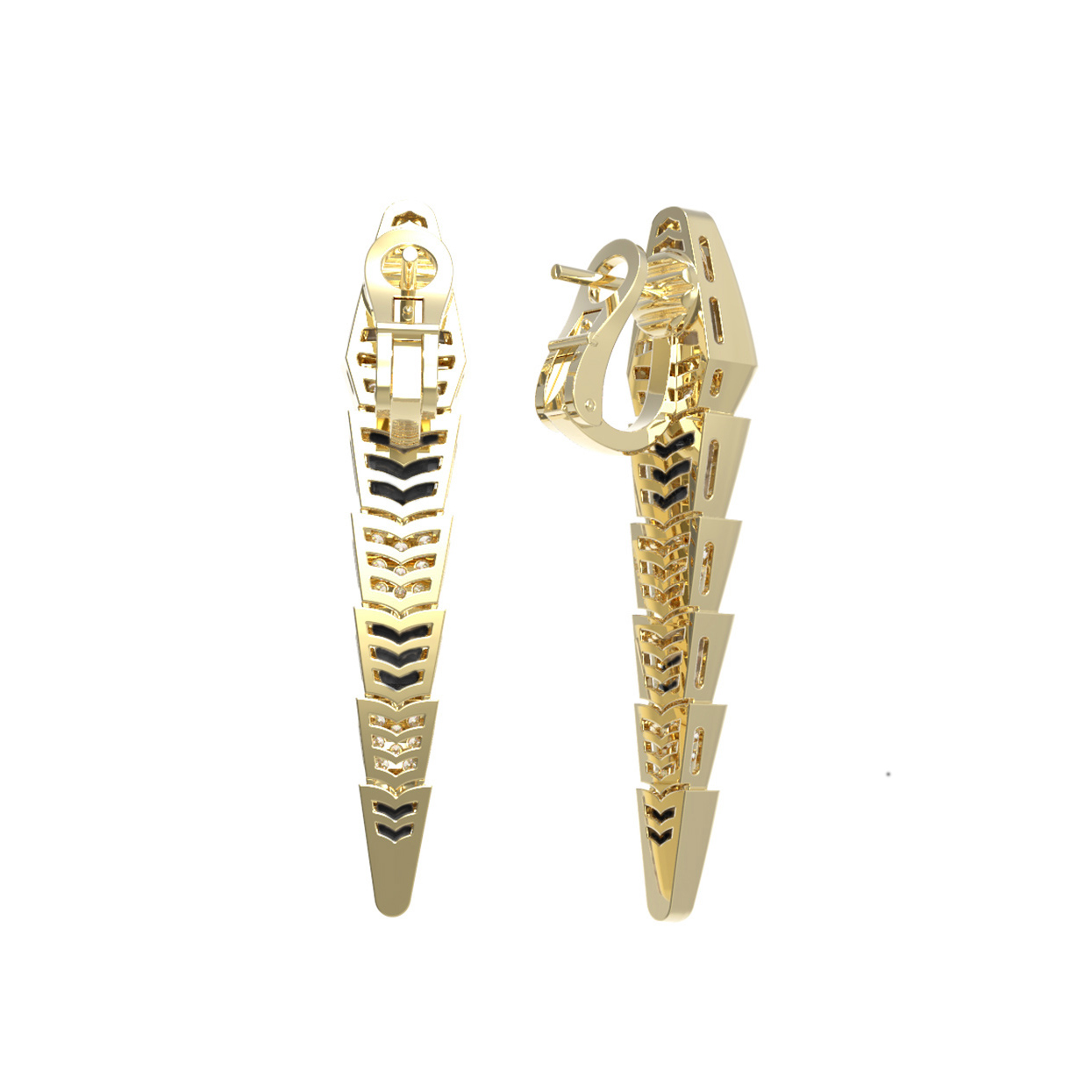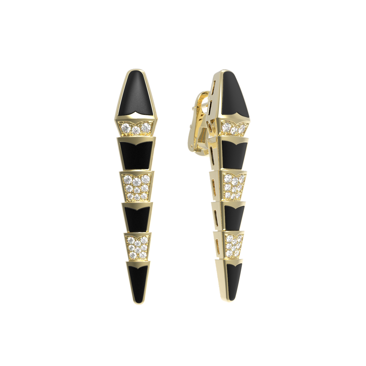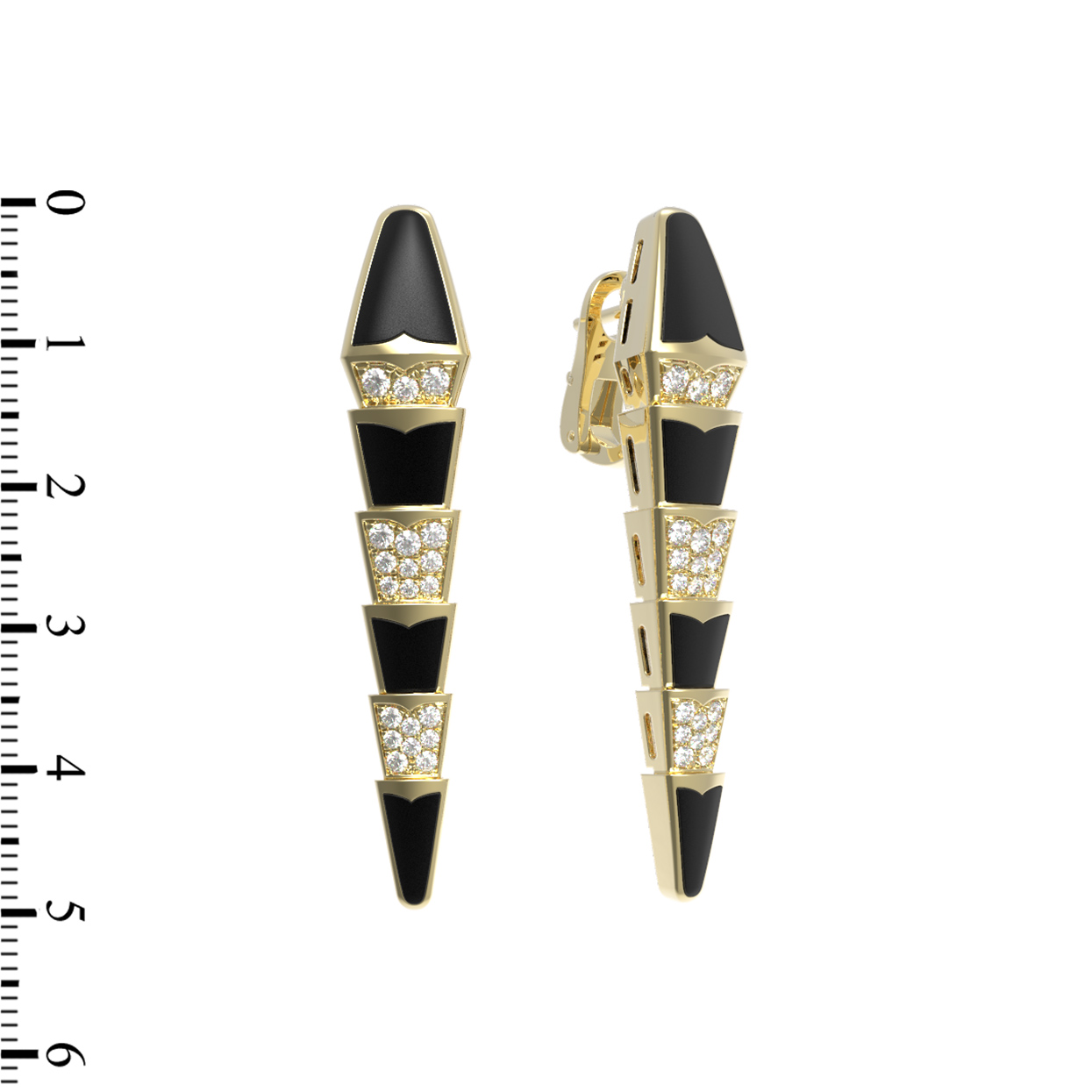 Декоративная часть инкрустирована 48 бриллиантами круглой формы, которые сияют белым светом, создавая роскошные переливы при каждом движении. Глубокий черный цвет оникса эффектно дополняет композицию, создавая драматичный и запоминающийся контраст. Эти серьги станут центральным элементом вашего стиля, подчеркивая статус и индивидуальность. Украшение универсально и подходит как для женщин, так и для мужчин, предпочитающих эксклюзивные аксессуары. Модель прекрасно сочетается с другими изделиями, позволяя создавать полноценные комплекты. Выбирая эти серьги, вы выбираете искусство в каждой детали.