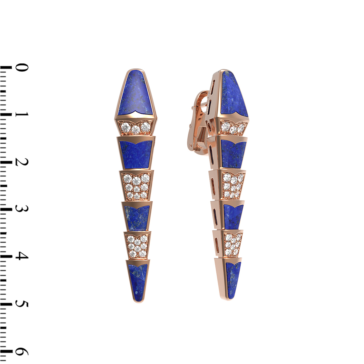 Роскошные серьги из коллекции De Luxe — Серпенти — это воплощение смелой эстетики и безупречного ювелирного мастерства. Изделие выполнено из благородного красного золота 585 пробы, чей теплый оттенок идеально гармонирует с глубоким синим цветом натурального лазурита. Оригинальный дизайн украшения вдохновлен образом скорпиона, что придает аксессуару нотки дерзости и загадочности.