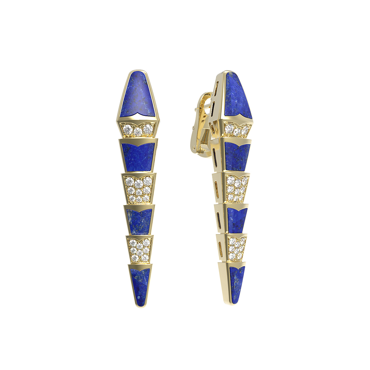 Эффектные серьги из коллекции De Luxe — Серпенти станут ярким акцентом вашего образа, подчеркивая безупречный вкус и статус. Украшение выполнено из благородного лимонного золота 585 пробы, чей теплый оттенок гармонично дополняет глубокий синий цвет натурального лазурита. Уникальный дизайн модели вдохновлен грацией и динамикой скорпионов, что отражено в изящной геометрической форме изделия.