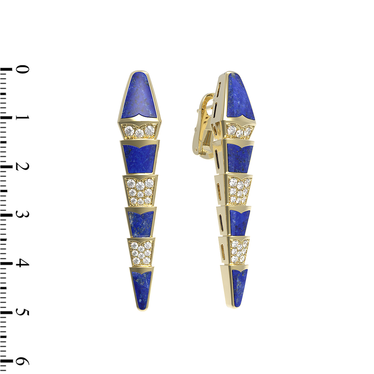Композиция украшена 48 круглыми вставками: сияющие белые бриллианты соседствуют с насыщенным лазуритом, создавая изысканный контраст. Такое сочетание материалов придает серьгам выразительный и современный вид. Ювелирное изделие подходит как для женщин, так и для мужчин, предпочитающих смелые и архитектурные украшения. Благодаря продуманному дизайну, серьги станут центральным элементом стиля, а возможность ношения в составе гармоничного комплекта позволит вам создавать завершенные и запоминающиеся образы.