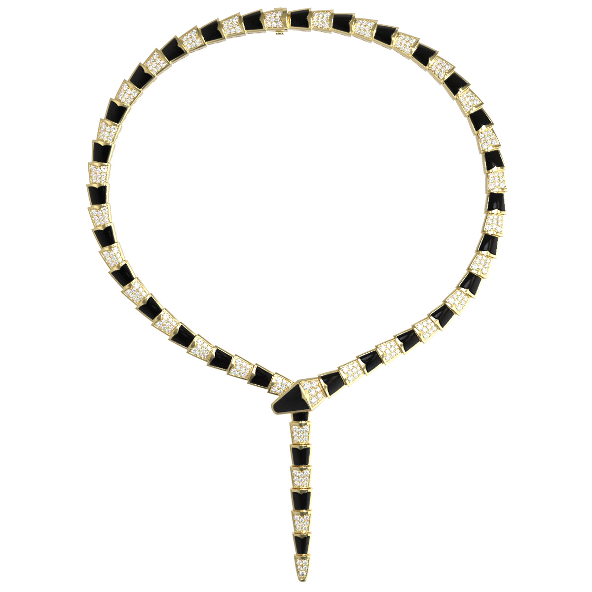 Особое внимание при создании колье уделено игре контрастов. Глубокий черный цвет оникса гармонично сочетается с холодным блеском белых бриллиантов, создавая выразительную палитру вставок. Всего в изделии использовано 310 вставок круглой формы, которые придают украшению невероятное сияние при каждом движении. Лимонный цвет золота служит благородной оправой, объединяя все детали в единую композицию.