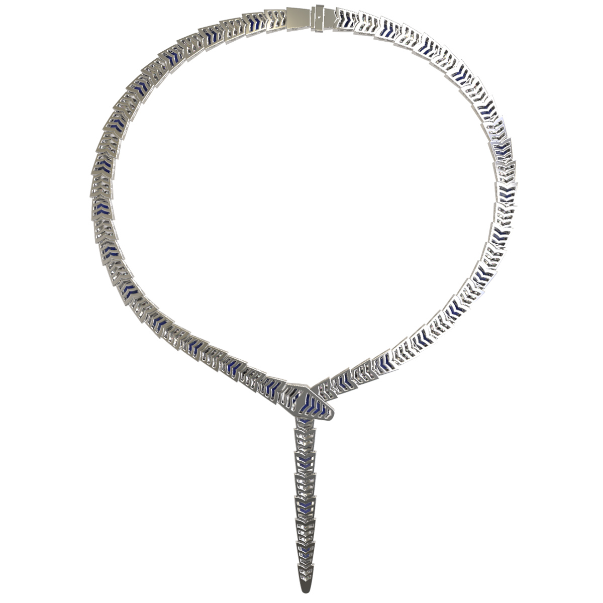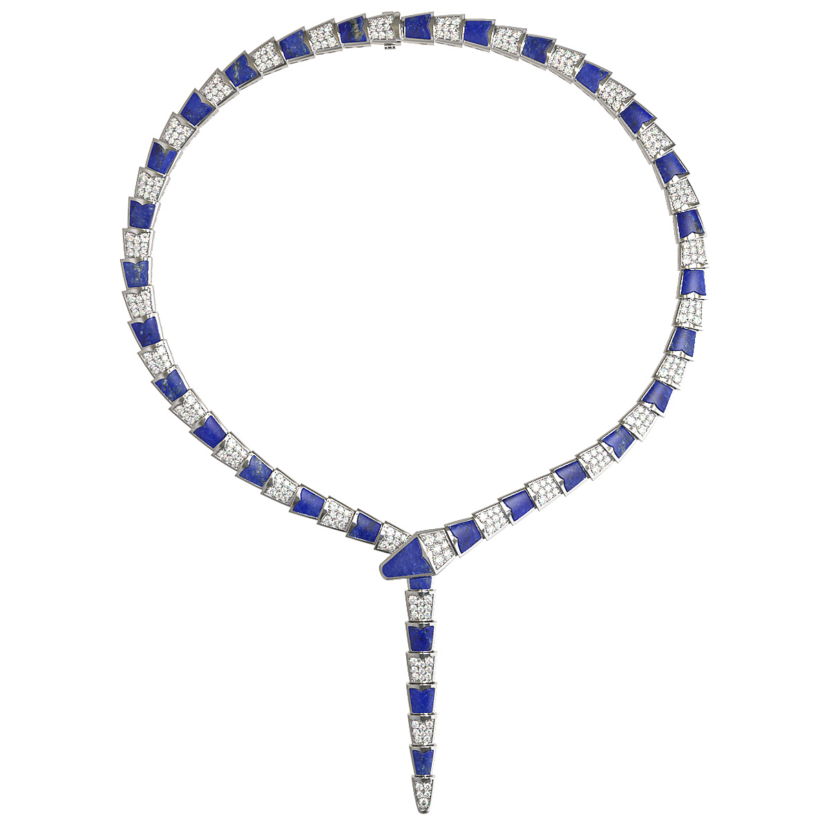 Дизайн изделия отличается особой эстетикой: сочетание белых бриллиантов и глубокого синего лазурита придает колье притягательную выразительность. Вставки круглой формы инкрустированы в металл с ювелирной точностью, общее количество камней составляет 310 штук. Холодный блеск бриллиантов и насыщенный оттенок лазурита делают это украшение заметным акцентом, который подойдет как для женщин, так и для мужчин.