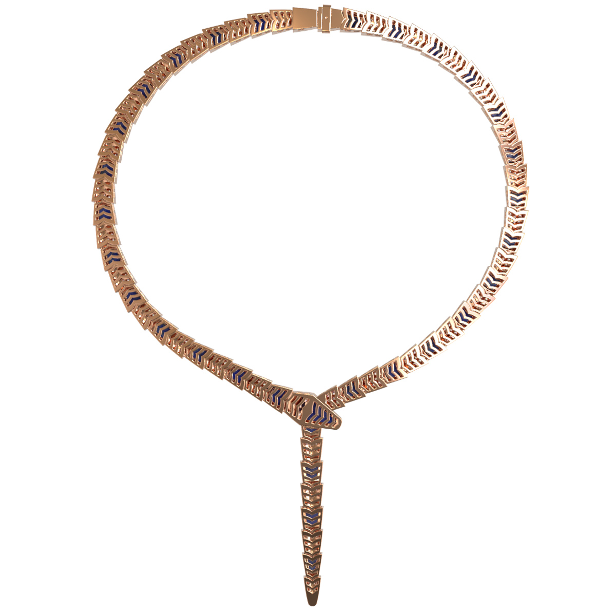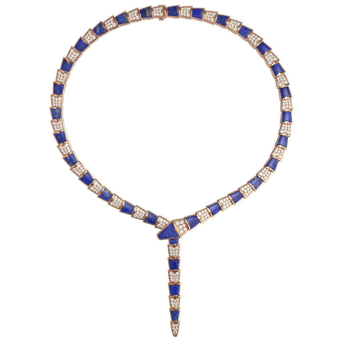 Мастерами была проделана кропотливая работа: конструкция колье декорирована 310 вставками, среди которых сочетаются благородный синий лазурит и сверкающие белые бриллианты круглой огранки. Глубокий синий цвет лазурита гармонично контрастирует с теплым блеском красного золота, а сияние камней добавляет изделию выразительности и роскоши. Данное украшение универсально — оно создано как для женщин, так и для мужчин, предпочитающих эксклюзивные ювелирные аксессуары.