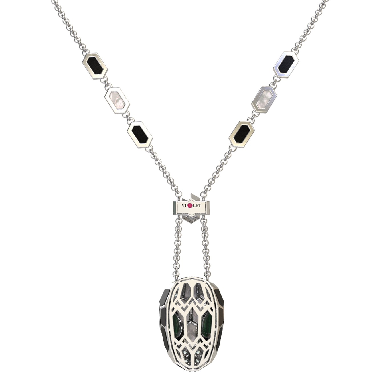 Колье из белого золота c бриллиантами, рубином, ониксом, малахитом и перламутром
