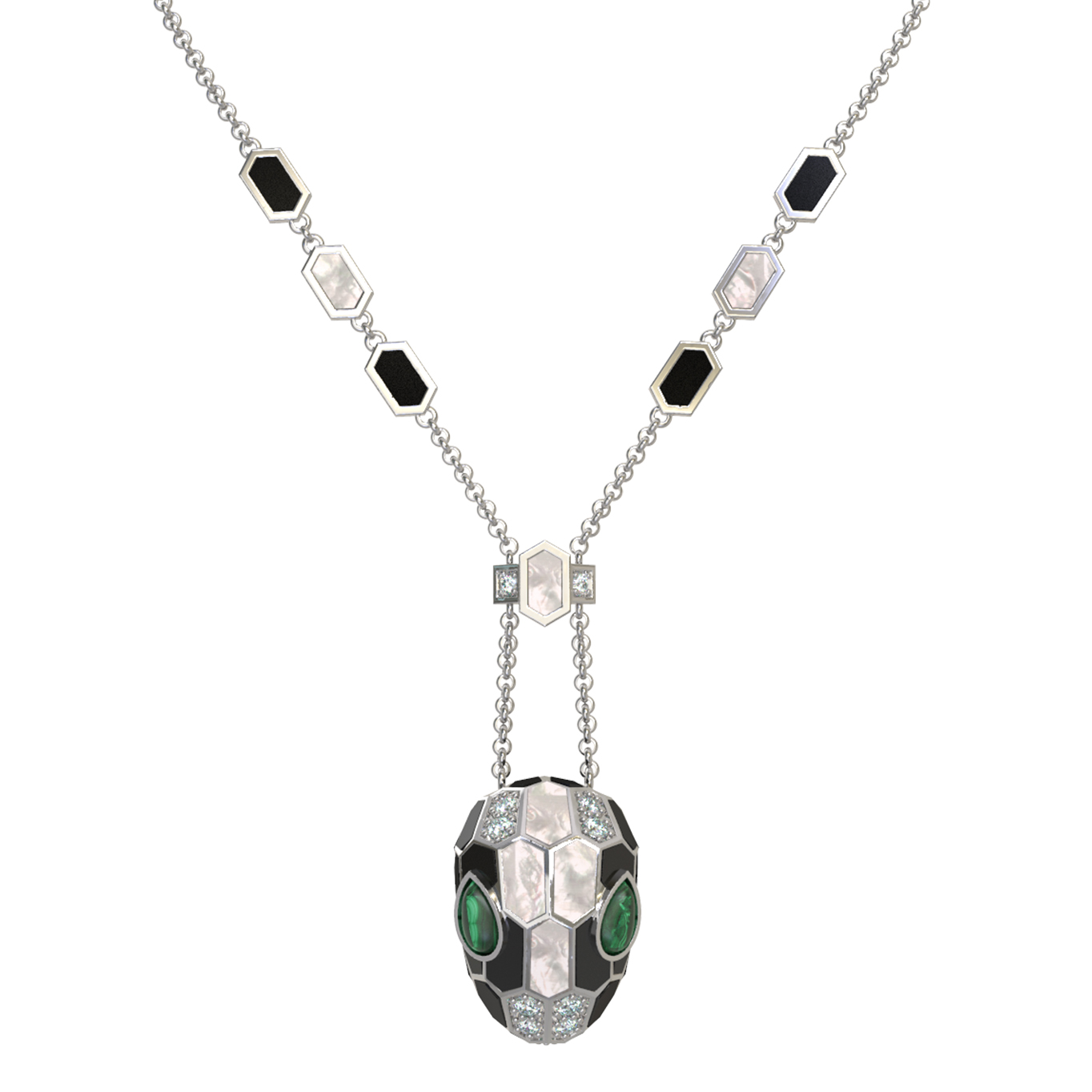 Эффектное колье из белого золота 585 пробы из коллекции De Luxe — Серпенти станет безупречным акцентом в вашем образе. Дизайн украшения, вдохновленный образом скорпиона, притягивает взгляд своей смелостью и утонченным сочетанием материалов. Ювелирная композиция объединила в себе 160 вставок: сверкающие бриллианты, благородный оникс, нежный перламутр, глубокий малахит и яркий рубин создают многогранную игру цвета и света. Контрастное сочетание белого, зелёного, красного, чёрного цветов и перламутра подчеркивает мастерство исполнения, а вставки формы груша и круг придают изделию особую выразительность.