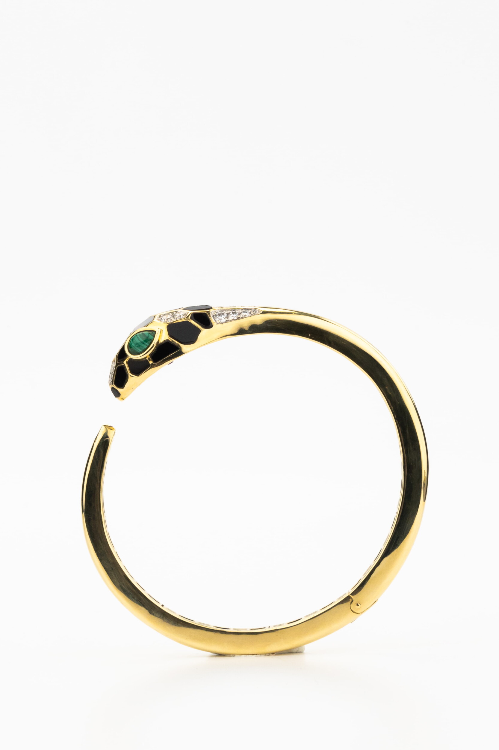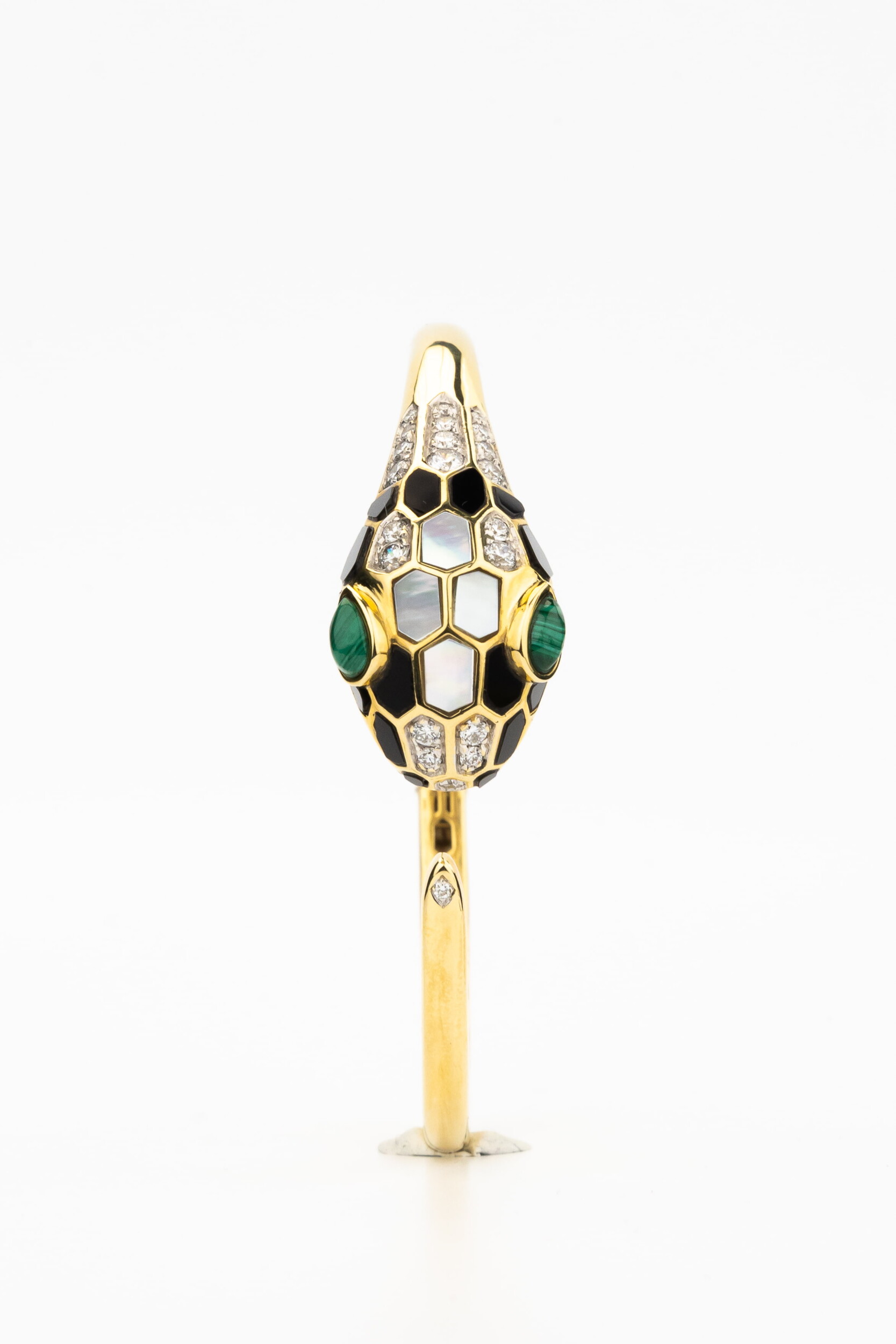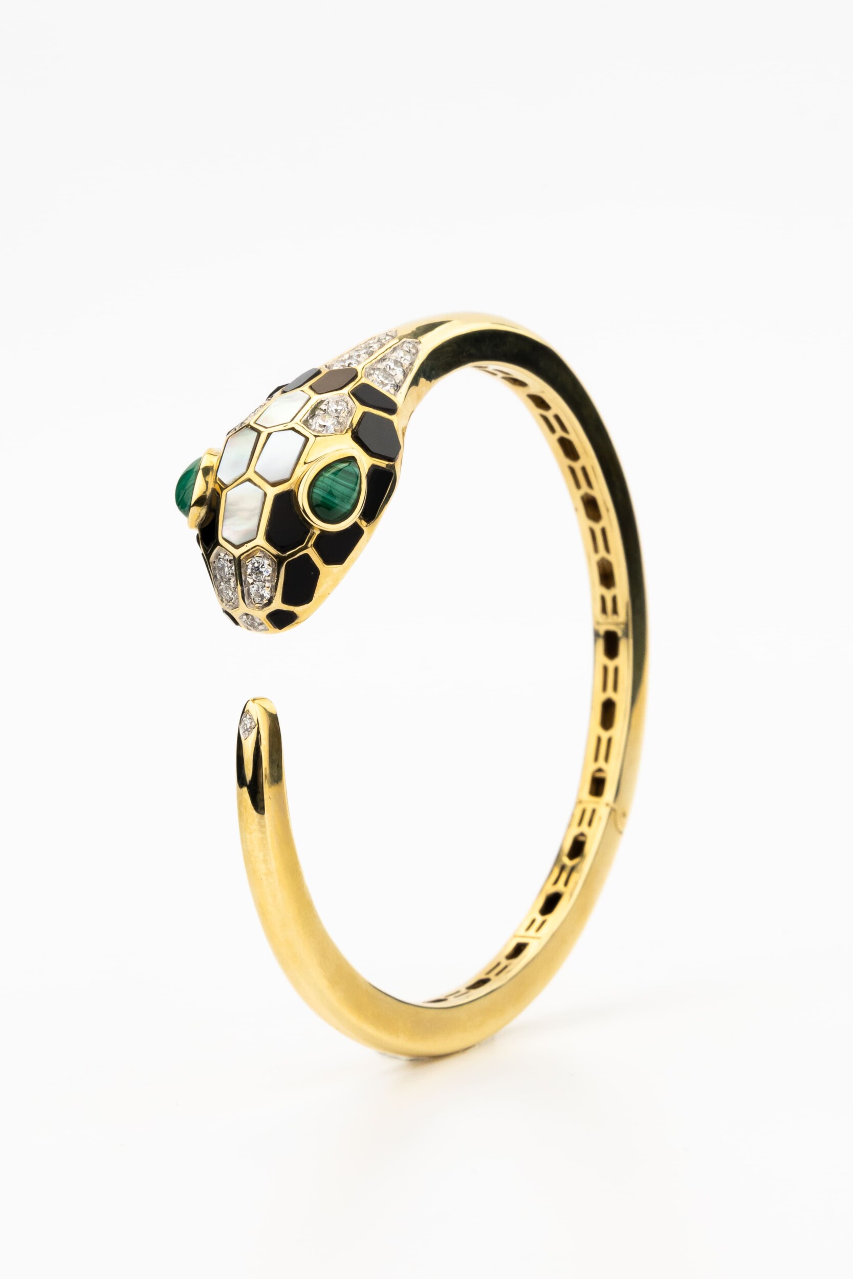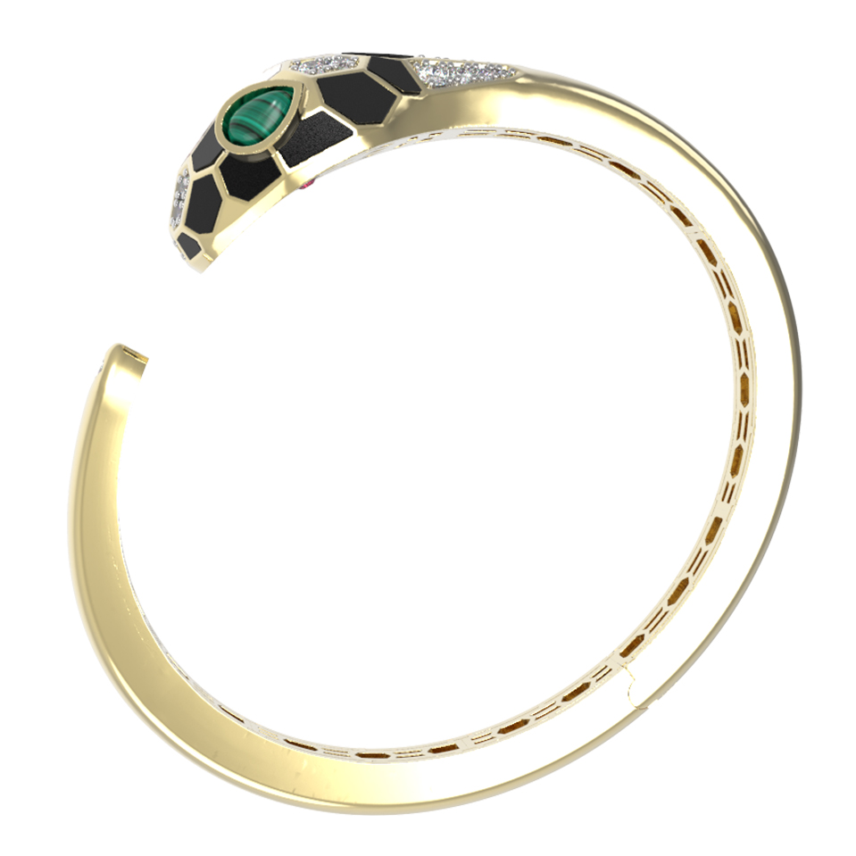 Особую художественную ценность браслету придает сложная инкрустация: композиция включает 164 вставки различных форм — круглой и грушевидной огранки. В отделке гармонично сочетаются бриллианты белого цвета, натуральный оникс, малахит, перламутр и яркий рубин. Такое многообразие материалов создает неповторимую игру фактур и контрастных цветов: от глубокого черного и зеленого до нежного перламутрового сияния. Ювелирное изделие одинаково стильно смотрится как на женской, так и на мужской руке, подчеркивая индивидуальность стиля.