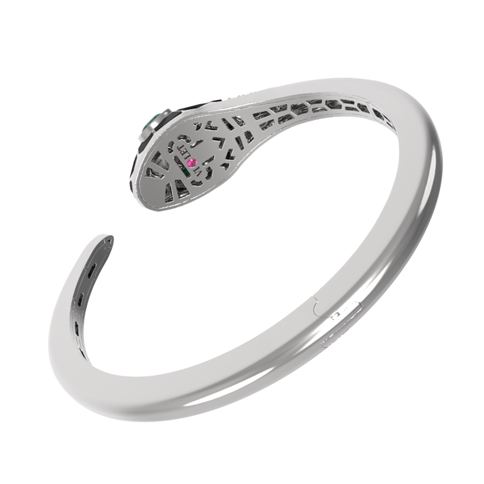 Вставки имеют классическую круглую и изящную форму груши, подчеркивая филигранную работу мастеров. Белое золото идеально дополняет многоцветную палитру камней — белых, зеленых, красных, черных и перламутровых оттенков, делая изделие выразительным и запоминающимся. Этот браслет является универсальным аксессуаром, который великолепно подходит как для женщин, так и для мужчин. Мы предлагаем размеры 16.5, 17.5, 18.5 и 19.5, чтобы вы могли подобрать идеальную посадку.