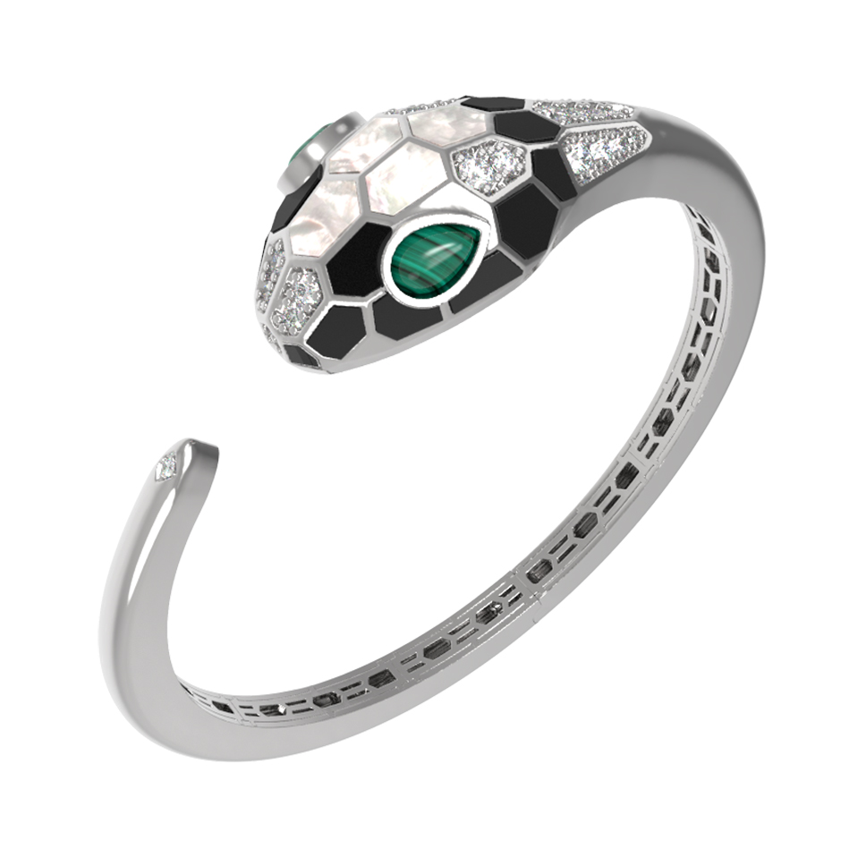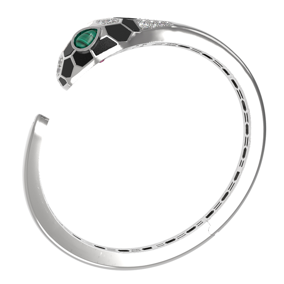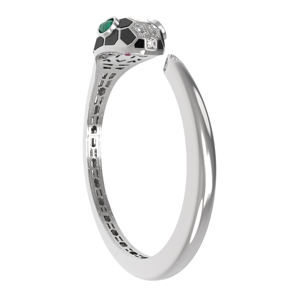 Эффектный браслет из белого золота 585 пробы из коллекции De Luxe — Серпенти станет воплощением вашего безупречного вкуса и статуса. Центральный элемент дизайна в виде изящного скорпиона притягивает взгляд своей детализацией и роскошным сочетанием материалов. Ювелиры использовали 164 вставки, чтобы создать неповторимую игру света и цвета. Россыпь сияющих бриллиантов контрастирует с глубоким черным ониксом, нежным перламутром и яркими акцентами малахита, а рубин добавляет украшению ноту страсти и благородства.