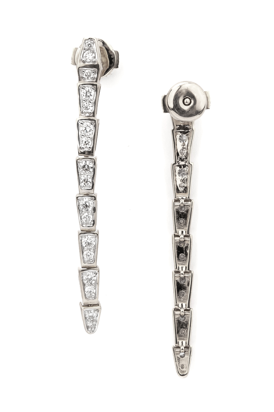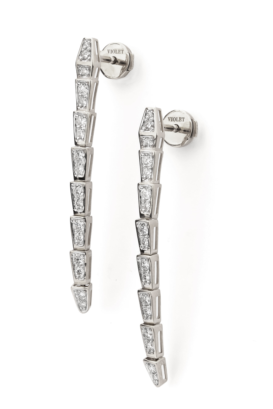 Серьги инкрустированы 34 бриллиантами круглой формы с чистым белым цветом вставок. Камни расположены так, чтобы максимально раскрыть свою игру света при каждом движении, создавая роскошный акцент в образе. Конструкция изделия обеспечивает комфортную посадку и надежную фиксацию.