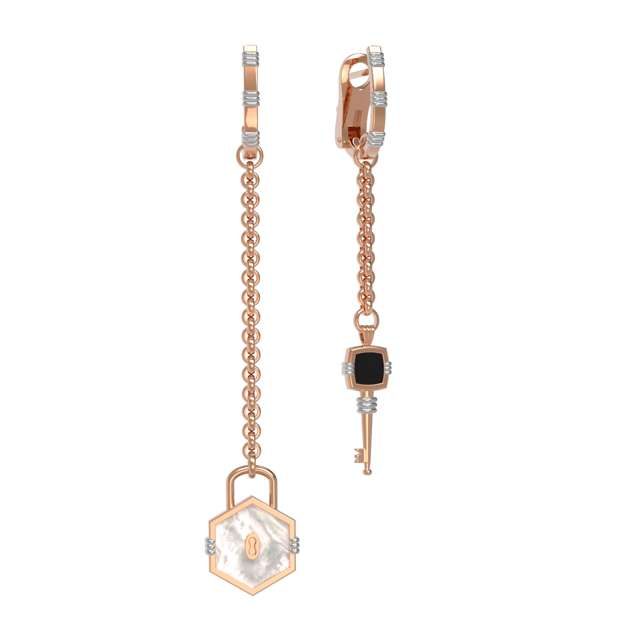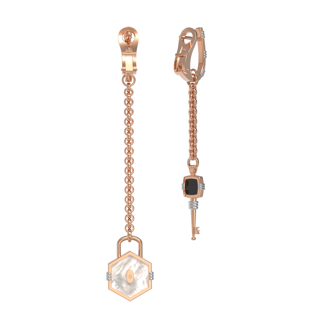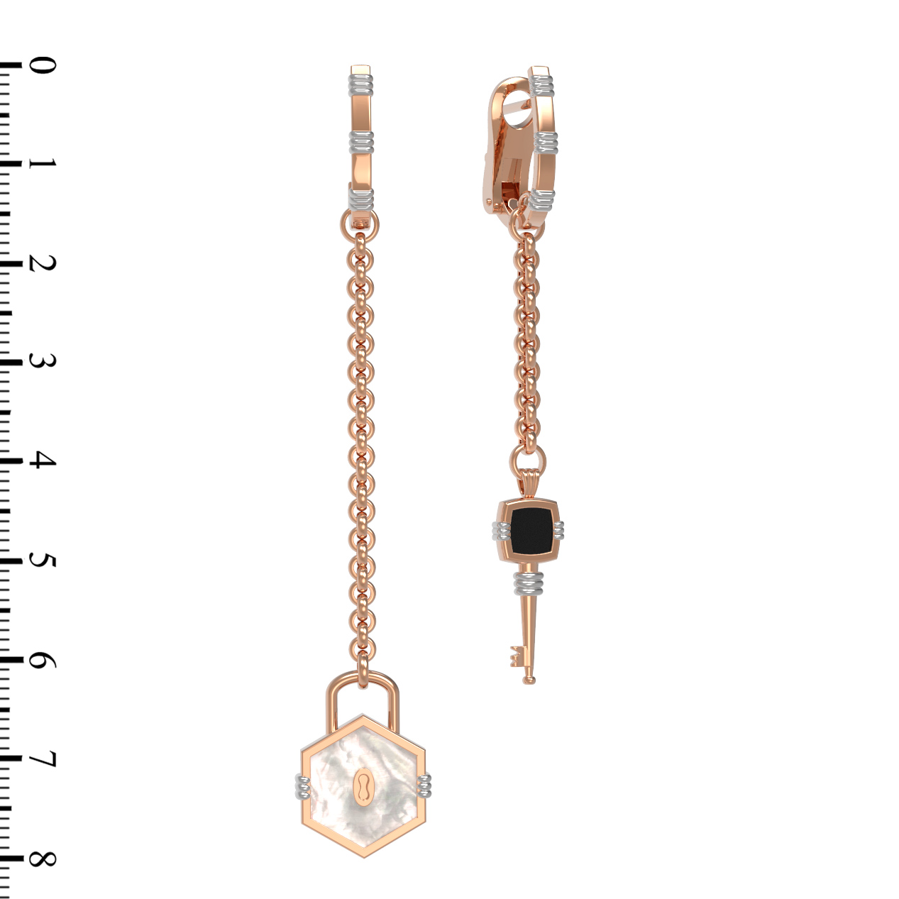 Элегантные и необычные серьги из красного золота 585 пробы станут символом вашего уникального стиля. Это украшение из коллекции De Luxe — Ключ от сердца притягивает взгляд своей сложной геометрией и продуманным дизайном в форме ключей. Контрастное сочетание драгоценных материалов делает аксессуар по-настоящему особенным: вставки из черного оникса и нежного перламутра подчеркивают благородный оттенок красного золота.