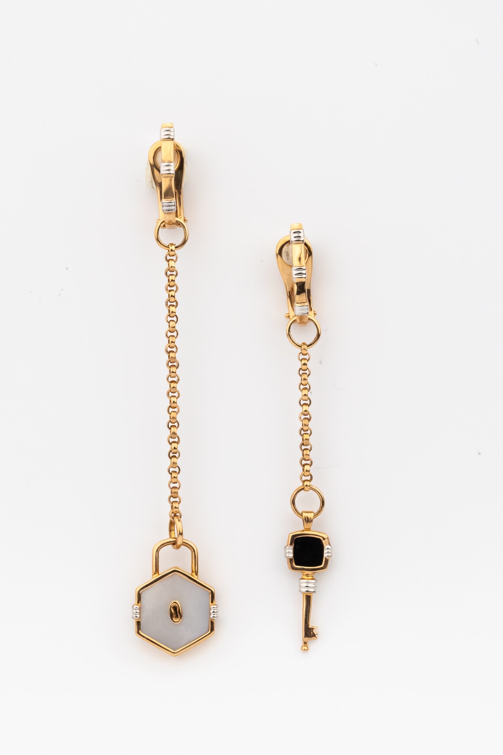 Мастерство исполнения и использование контрастных вставок черного и перламутрового цвета превращают серьги в настоящий акцент образа. Дополните свою коллекцию украшением, которое сочетает в себе эстетику современного ювелирного искусства и классическую роскошь золота.