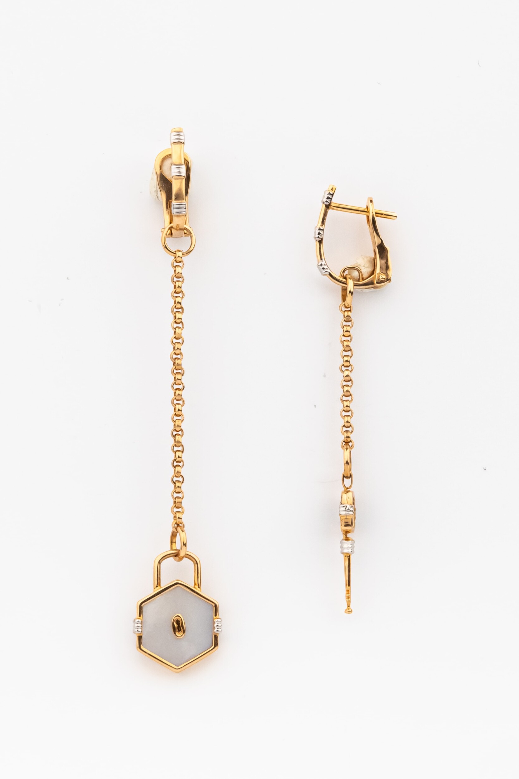Серьги включают две вставки шестигранной формы, каждая из которых наделена глубоким смыслом. Изящная цепочка придает украшению динамику, позволяя ему эффектно играть при каждом движении. Это ювелирное изделие универсально: оно создано как для женщин, так и для мужчин, предпочитающих смелые и современные украшения. Серьги прекрасно смотрятся как самостоятельный аксессуар, так и в составе гармоничного комплекта.