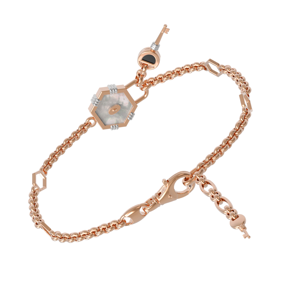Контрастное сочетание вставок разной формы — полукруг и шестигранник — создает гармоничный визуальный акцент. Красное золото в сочетании с перламутром и ониксом смотрится выразительно и современно. Этот браслет одинаково хорошо подходит как для женщин, так и для мужчин, подчеркивая индивидуальность владельца. Уникальность дизайна позволяет носить его как самостоятельное украшение, так и в составе комплекта, дополняя образ другими изделиями из этой же серии.