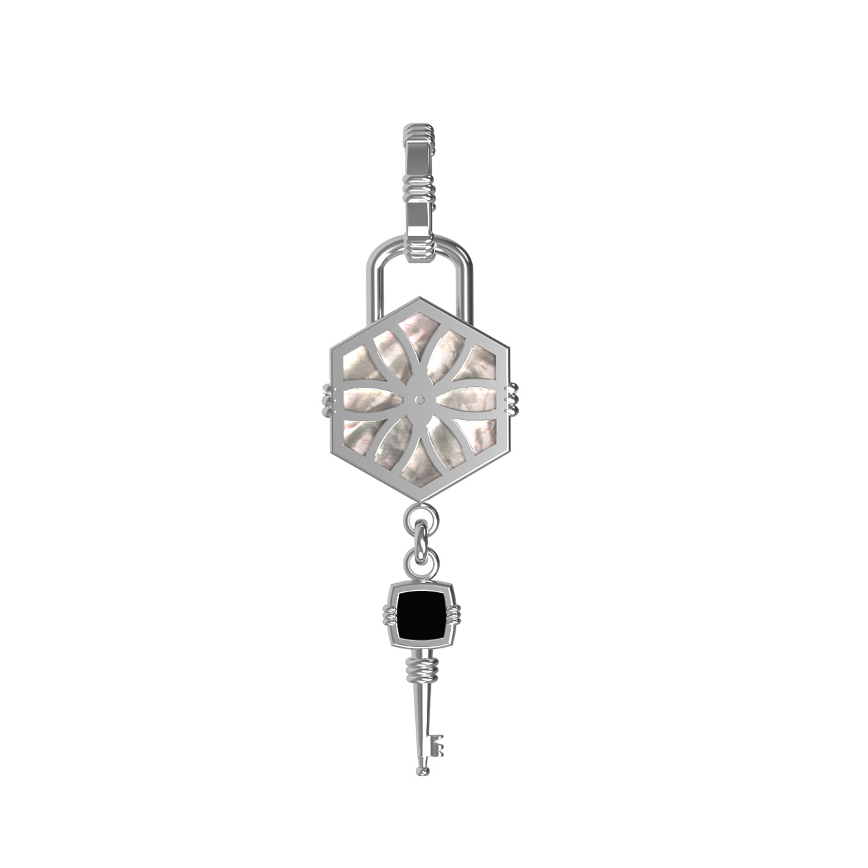 Центральным элементом композиции является вставка в форме шестигранника, выполненная из переливающегося перламутра. Контраст светлого перламутра подчеркивает глубокий, насыщенный черный цвет оникса. В общей сложности в изделии использованы 2 вставки, которые придают украшению особый визуальный объем и благородное сияние. Белое золото создает холодный и чистый фон, идеально гармонирующий с натуральными камнями.