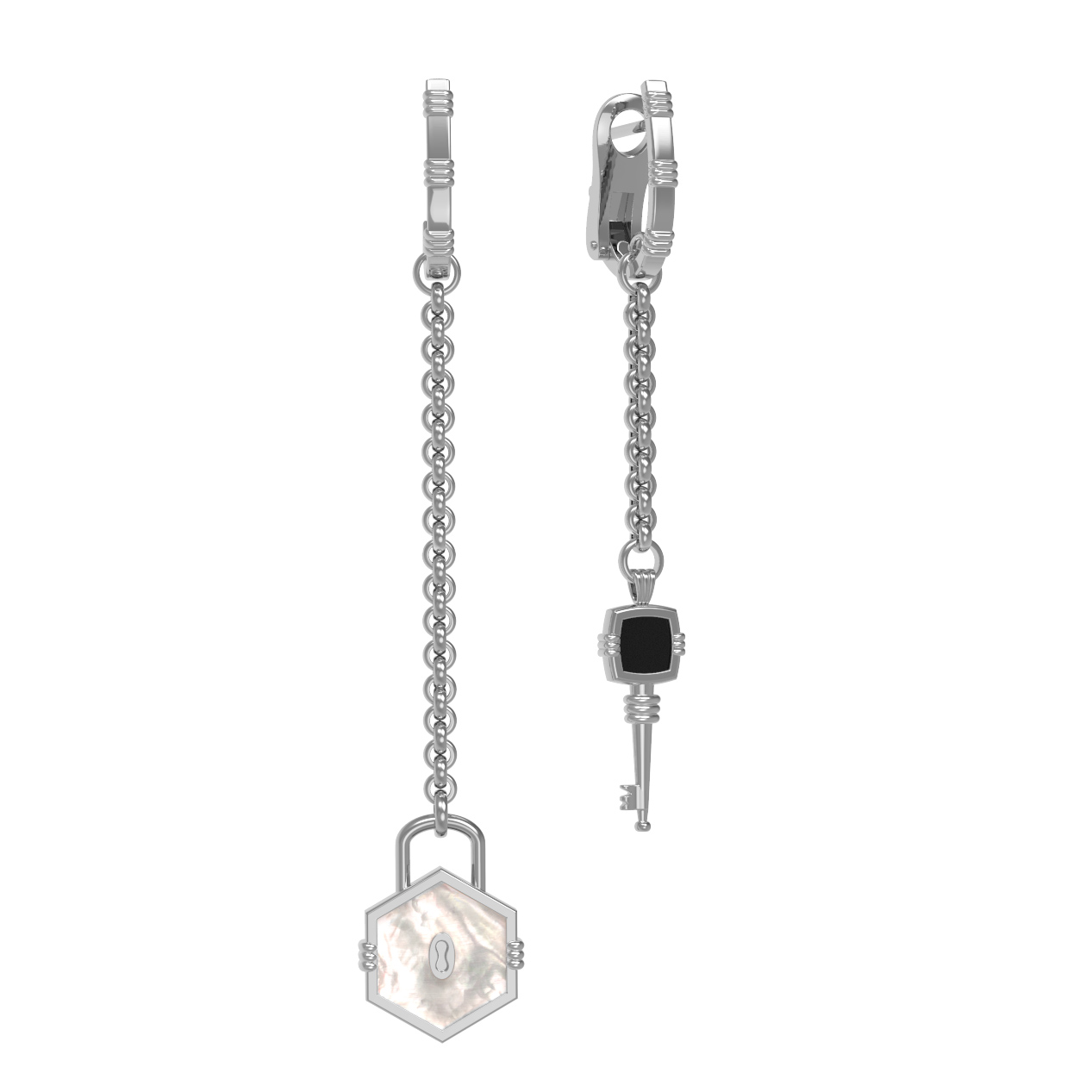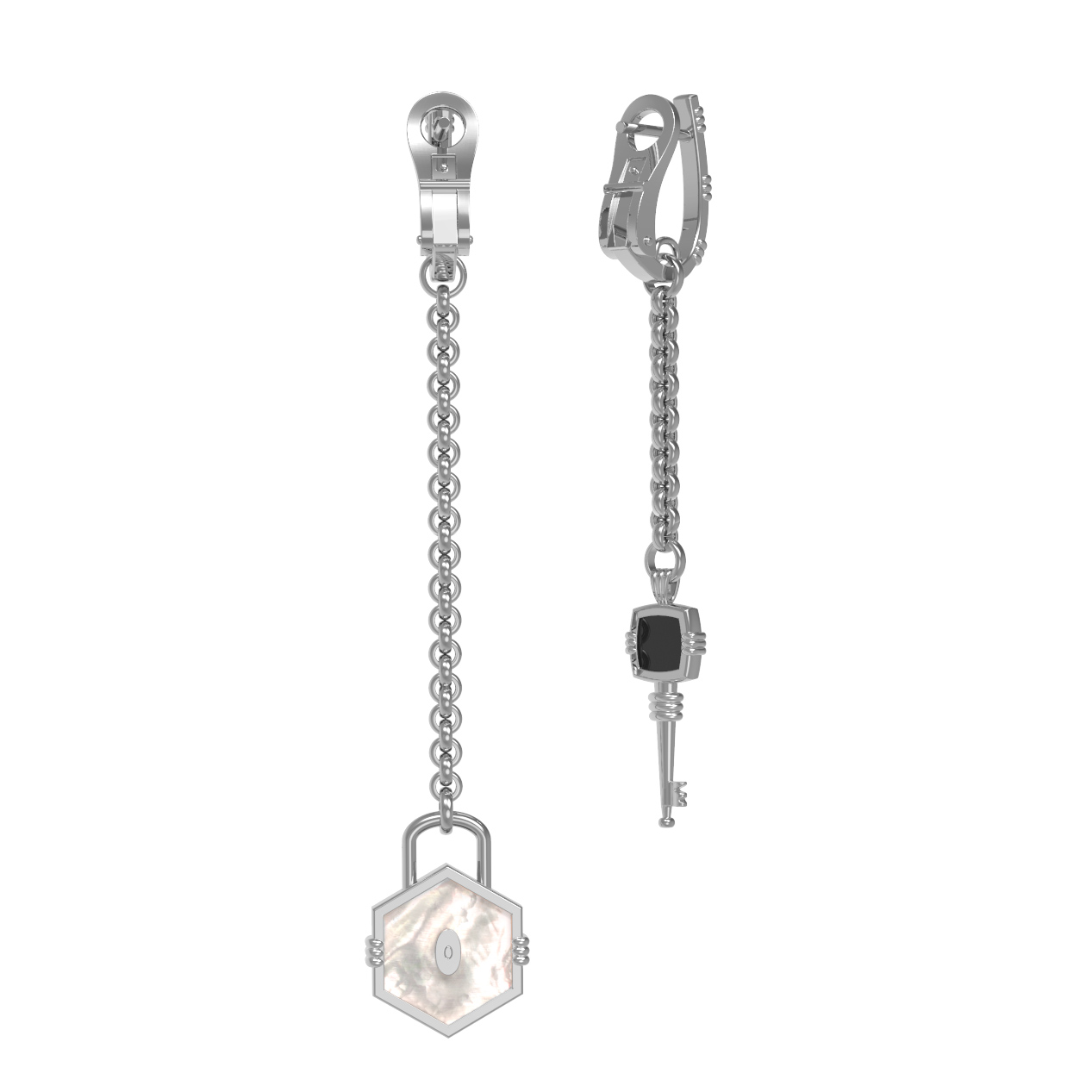 Особую утонченность серьгам придают вставки в форме шестигранника: глубокий черный оникс и нежный переливчатый перламутр создают изысканный контраст. Всего в изделии использовано 2 вставки, гармонично сочетающиеся с прохладным оттенком белого золота. Благодаря универсальному дизайну эти серьги подходят как для женщин, так и для мужчин, позволяя создавать уникальные стилистические решения.