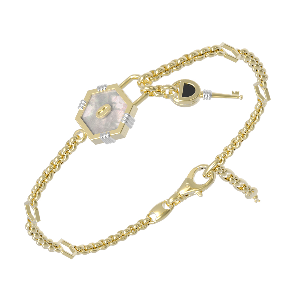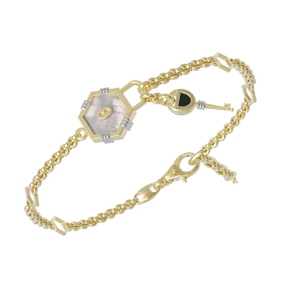 Композицию дополняют две вставки: благородный черный оникс и нежный перламутр. Контрастное сочетание цветов вставок — перламутрового и черного — придает изделию динамику и выразительность. Геометрические формы элементов, включающие полукруг и шестигранник, создают гармоничный баланс между строгостью линий и мягким мерцанием материалов. Лимонный оттенок золота добавляет украшению теплоты и мягкого сияния, делая его идеальным дополнением к любому повседневному или вечернему ансамблю.