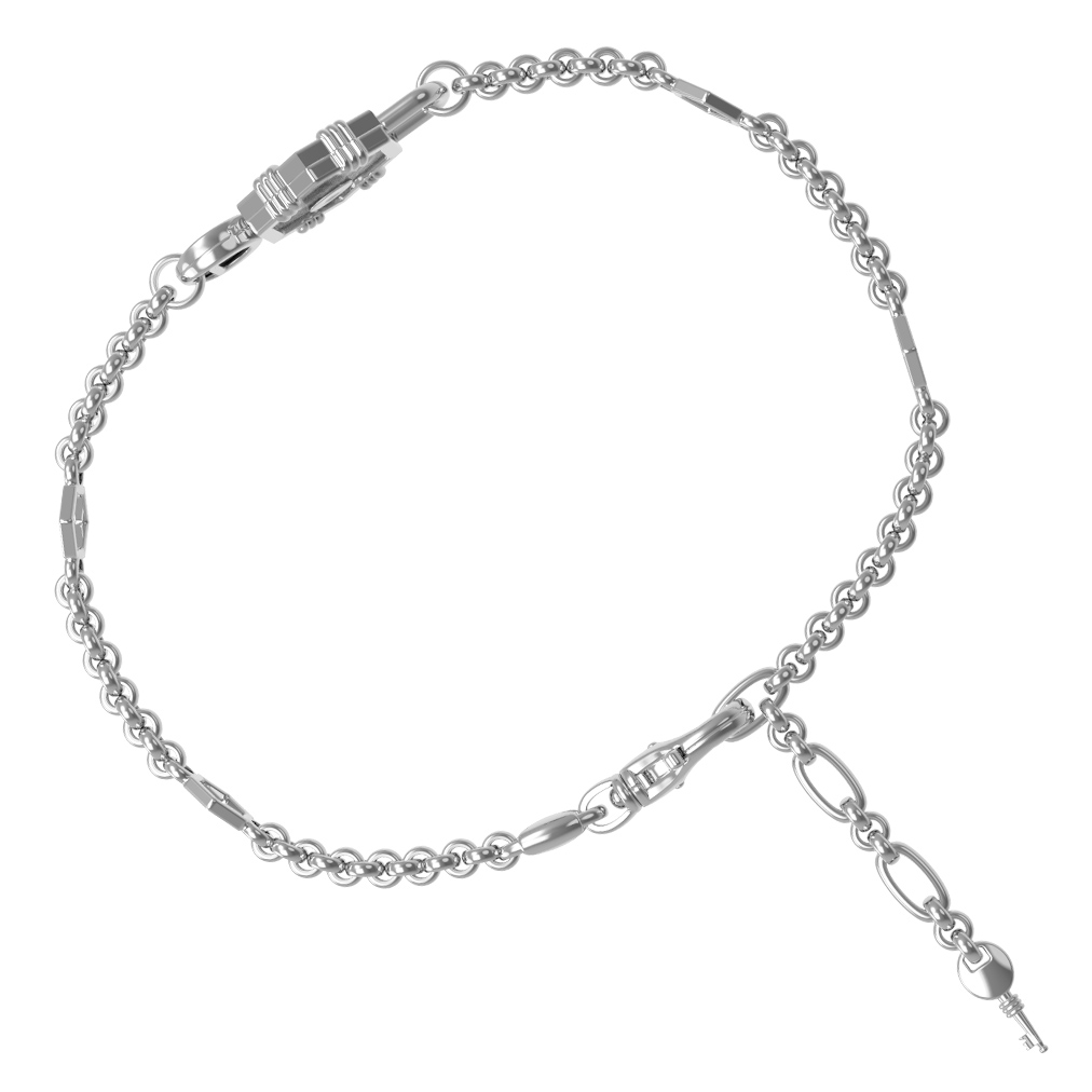 Это украшение из коллекции De Luxe — Ключ от сердца станет достойным дополнением к вашей шкатулке. Браслет отличается универсальностью: он одинаково эффектно смотрится как на женщинах, так и на мужчинах, подчеркивая индивидуальный стиль владельца. В изделии использовано 2 вставки, которые мастерски вписаны в общую структуру цепи. Такое украшение прекрасно вписывается в концепцию создания полноценных комплектов, позволяя комбинировать его с другими аксессуарами из той же серии для создания гармоничного ювелирного ансамбля. Лаконичная форма и высокое качество исполнения делают этот браслет из белого золота удачным выбором для тех, кто ценит эстетику с глубоким символическим значением.