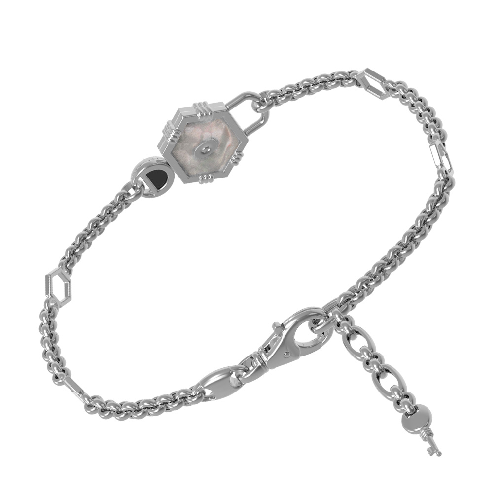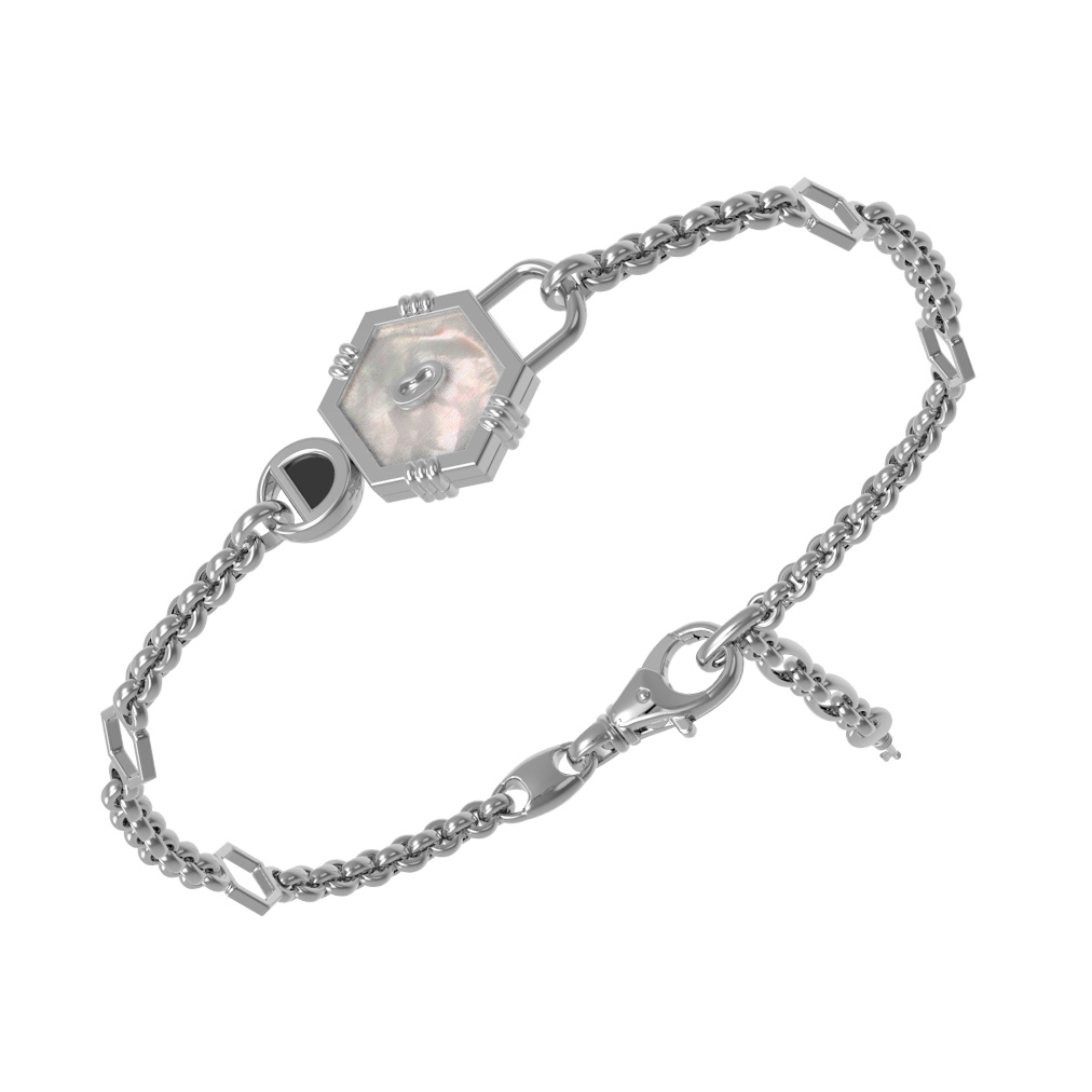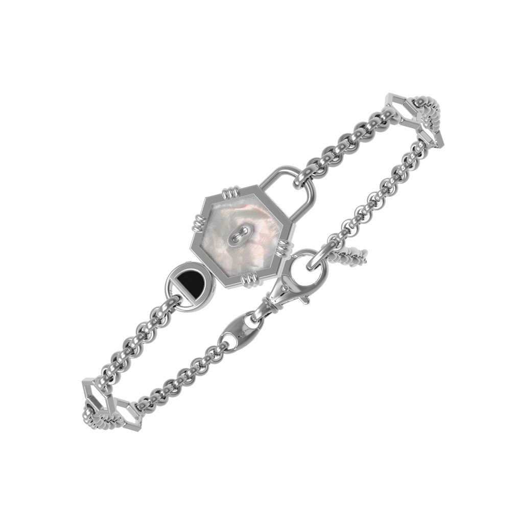 Элегантный браслет из белого золота 585 пробы — это украшение, в котором гармонично сочетаются классическая роскошь и современная эстетика. Дизайн изделия, вдохновленный образом ключа, придает аксессуару особенный смысл и утонченность, делая его идеальным акцентом в любом образе. Центральным элементом композиции является изящная деталь в форме шестигранника, инкрустированная перламутром, и акцентная вставка из оникса в форме полукруга. Контраст между глубоким черным цветом оникса и нежным сиянием перламутра создает выразительный визуальный эффект, подчеркивая благородство белого золота.