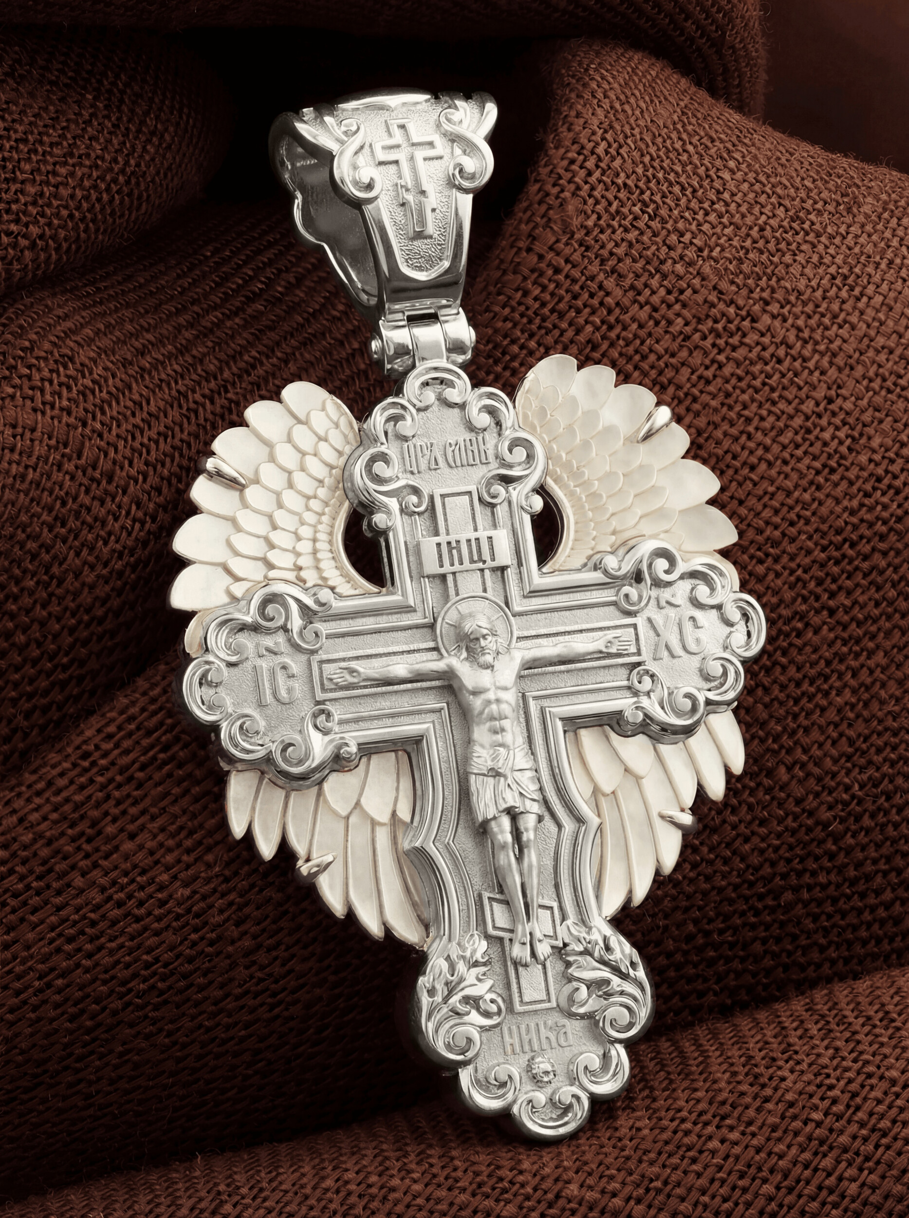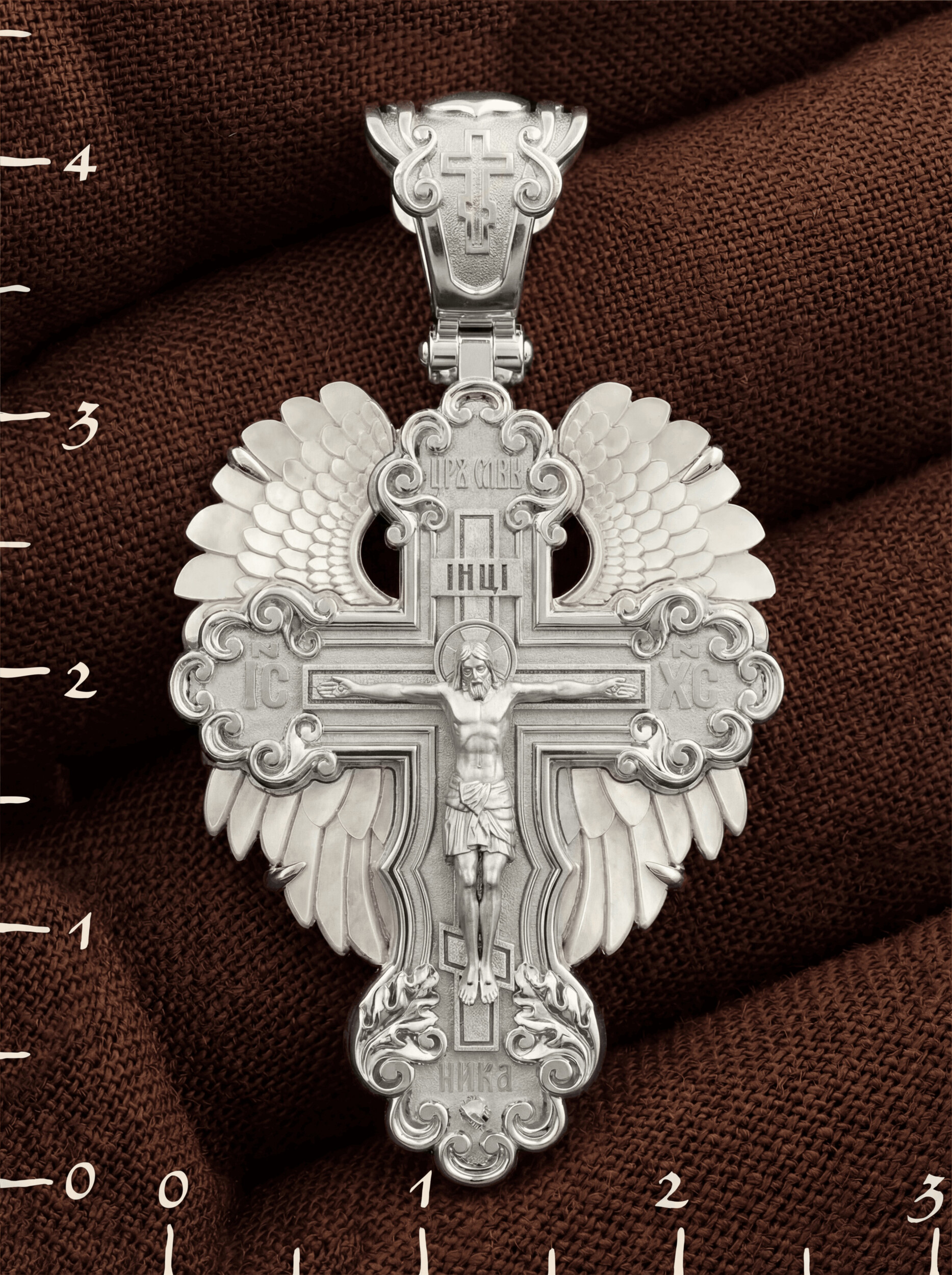 На лицевой стороне креста изображено Распятие Господа и Спасителя нашего Иисуса Христа. В Голгофе сокрыта непостижимая тайна бесконечной правды и любви Бога. Крест стал символом победы добра над злом, жизни над смертью, напоминанием бесконечной Божьей любви, предметом радости. Воплотившийся Сын Божий Своею кровью освятил крест и сделал его проводником Своей благодати, источником освящения верующих. Господь сказал: кто хочет идти за Мною, отвергнись себя, и возьми крест свой, и следуй за Мною. (Мк. 8: 34). Над Распятием помещена надпись «Царь Славы». Ниже расположена перекладина которая символизирует титло — табличку, на которой, согласно Евангелию, было начертано: Иисус Назорей Царь Иудейский (IНЦI). Надпись «IС ХС» означает Иисус Христос, помещается на разных сторонах поперечной перекладины креста. В нижней части креста помещено слово «НИКА», что означает «победитель». Крест стоит на горе камней, символизирующих Голгофу. В ее основании различается череп — это голова Адама.