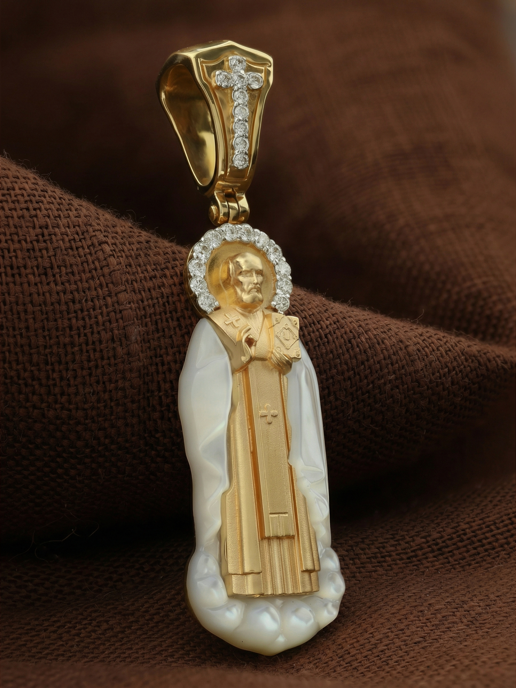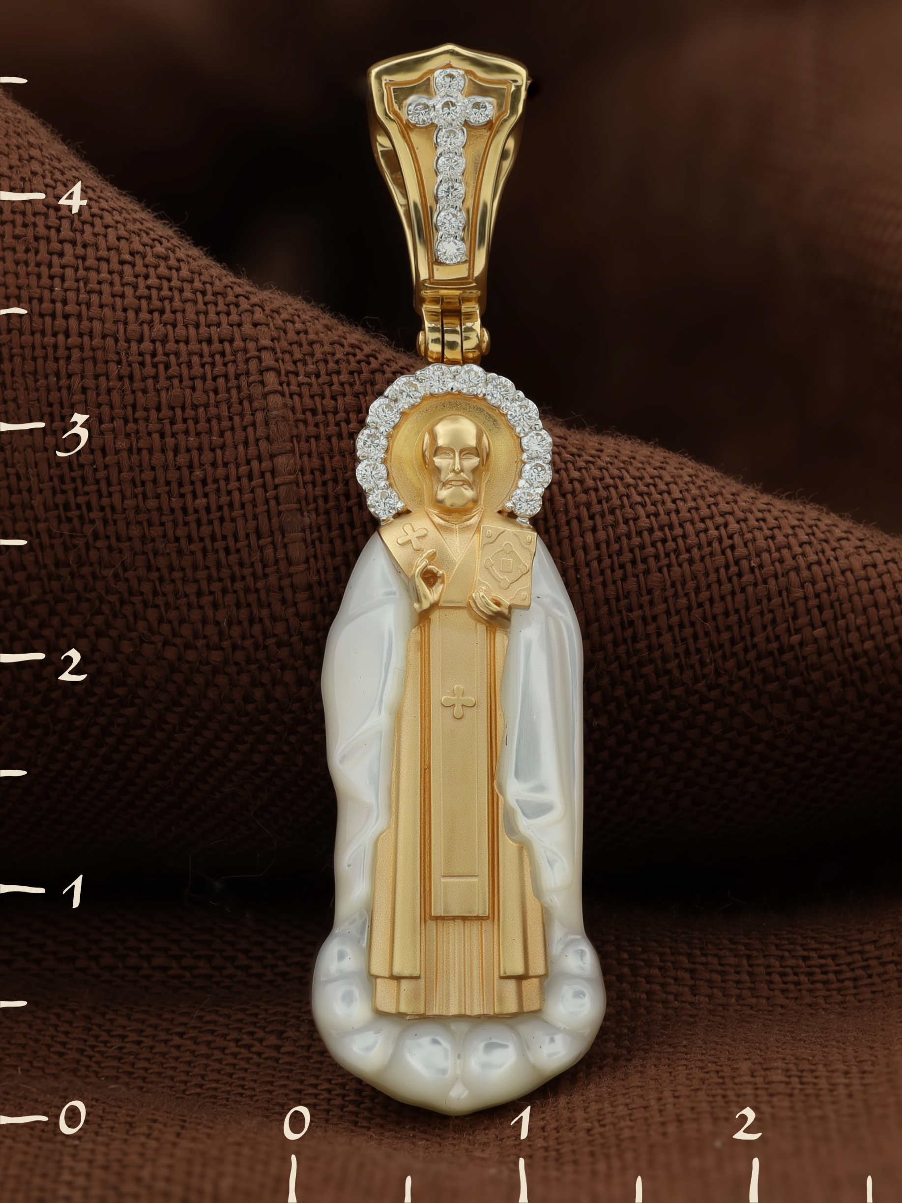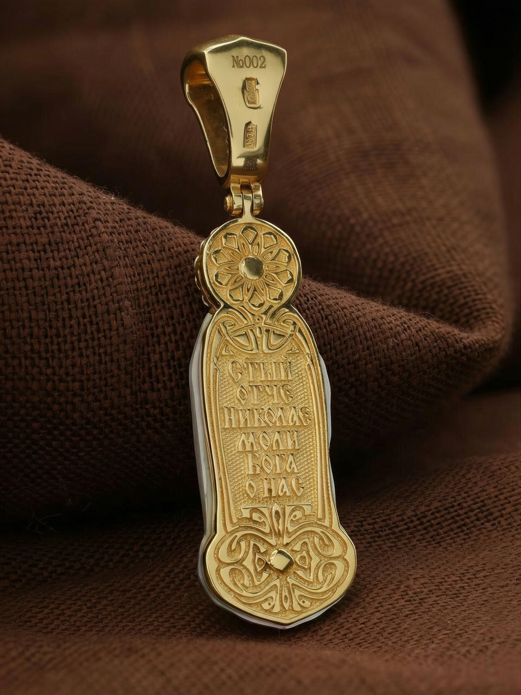 На образке изображен Святитель Николай архиепископ Мир Ликийских, Чудотворец. Он является одним из самых почитаемых святых в православном мире. Святитель Николай родился во второй половине III века в Малой Азии в Ликийском городе Патары. С рождения Божий Угодник проявлял необыкновенные дарования. Сохранилось Предание, что во время крещения он, никем не поддерживаемый, простоял в купели три часа. С детства Святитель избегал пустых развлечений, любил молитву, прекрасно учился и проводил свободное время за чтением Священного писания. Приняв сан священника, святитель Николай стал проводить еще более строгую подвижническую жизнь. Избранник Божий Николай стал вершиной всех добродетелей, поднятой до райской высоты. С кем из величайших праведников не сравнялся он образом духовной красоты, кому из них не последовал в своих деяниях и чудотворениях? Всеблаженный Николай был кроток, как Моисей, мужественен, как Давид, славен простотой нрава, как Иаков. Словно Ной, он спасал стадо Господне в новом ковчеге от потопа ересей. Вся жизнь святого Николая — это служение Богу. Много великих и преславных чудес сотворил на земле и на море великий Святитель Николай Угодник. Он помогал сущим в бедах, укрощал штормы, спасал от потопления и выносил на сушу из глубины морской, освобождал из плена и приносил освобожденных домой, избавлял от уз и темницы, защищал от посечения мечом, освобождал от смерти и подавал многим различные исцеления, слепым прозрение, хромым хождение, глухим слух, немым дар слова.